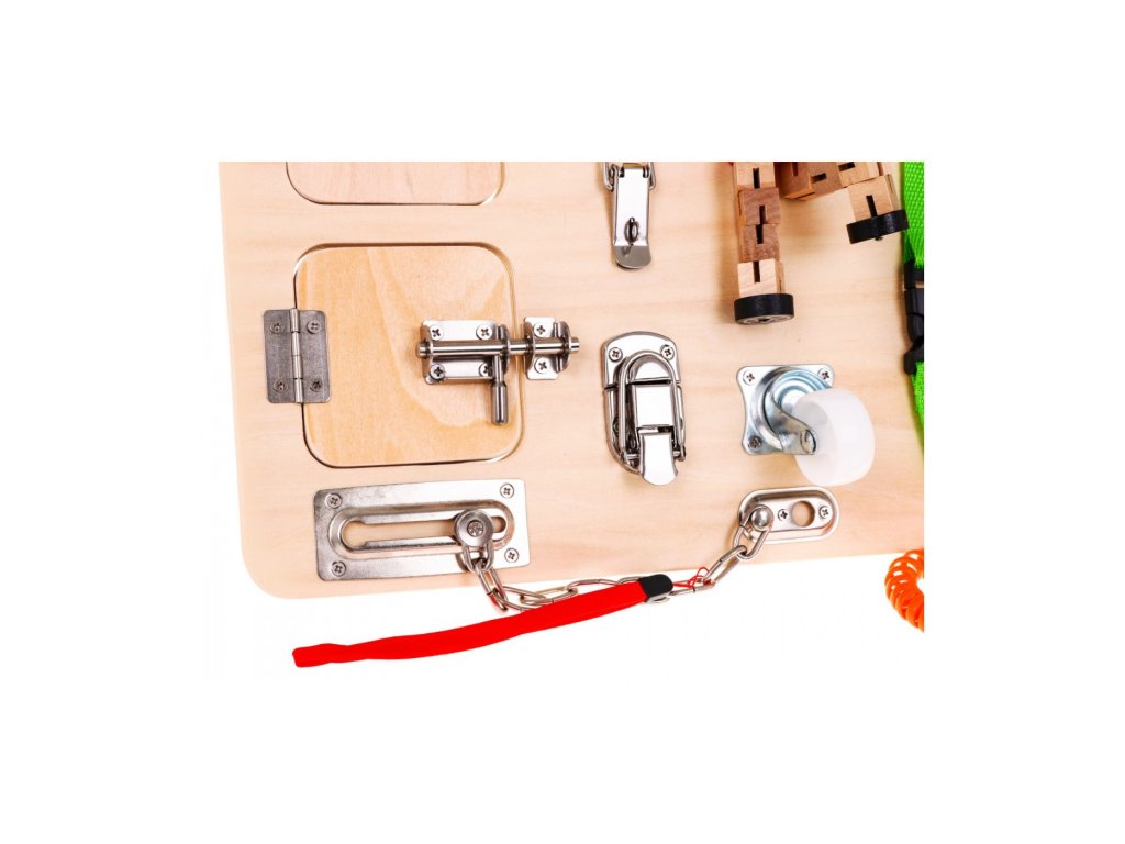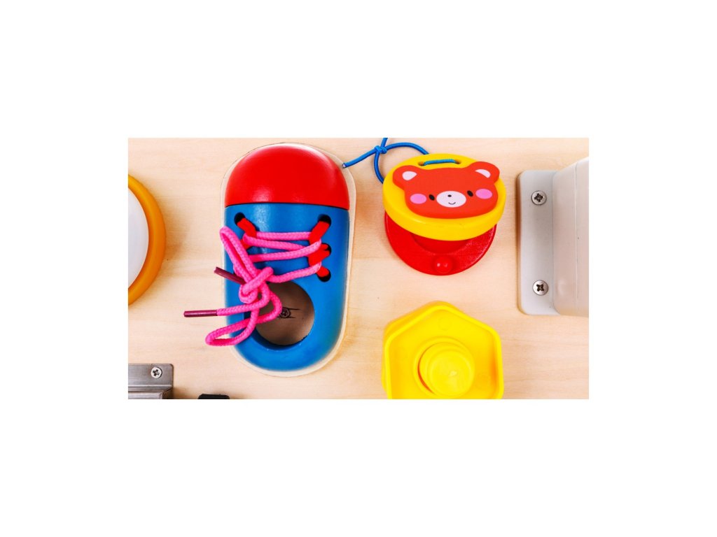 Aktivna ploča senzorna edukativna سطح je multifunkcionalna igračka, namijenjena djeci od 3 godine. Set se sastoji od ploče s pričvršćenim elementima koje djeca susreću u svakodnevnom životu. Igra potiče razvoj vještina u području fine motorike, logičkog razmišljanja i analize uzroka i posljedica. Ploča sadrži zvučne i svjetlosne elemente na upravljaču. Set se napaja s 2 x AA baterijama, koje nisu uključene u pakiranje.