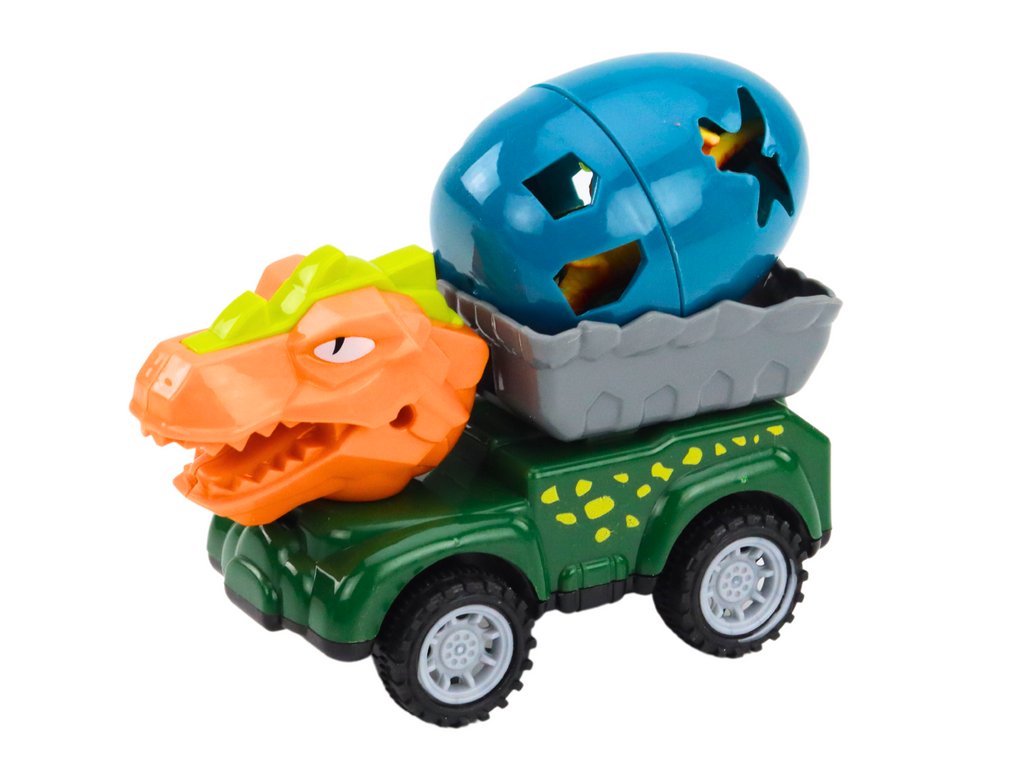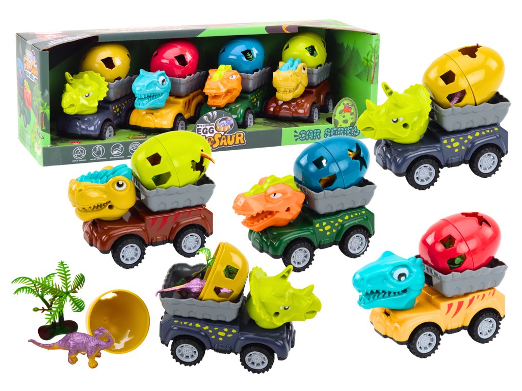 Ovaj set igračaka pravo je zadovoljstvo za male ljubitelje dinosaura i vozila! Sadrži četiri različita vozila, svako s jedinstvenim izgledom i funkcijama. Svako auto ima prikolicu s velikim dinosaurovim jajetom. Jaje je posebno po tome što se može otvoriti kako bi otkrilo skrivenu figuricu dinosaura i palmu, što dodatno obogaćuje igru.