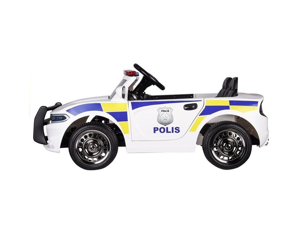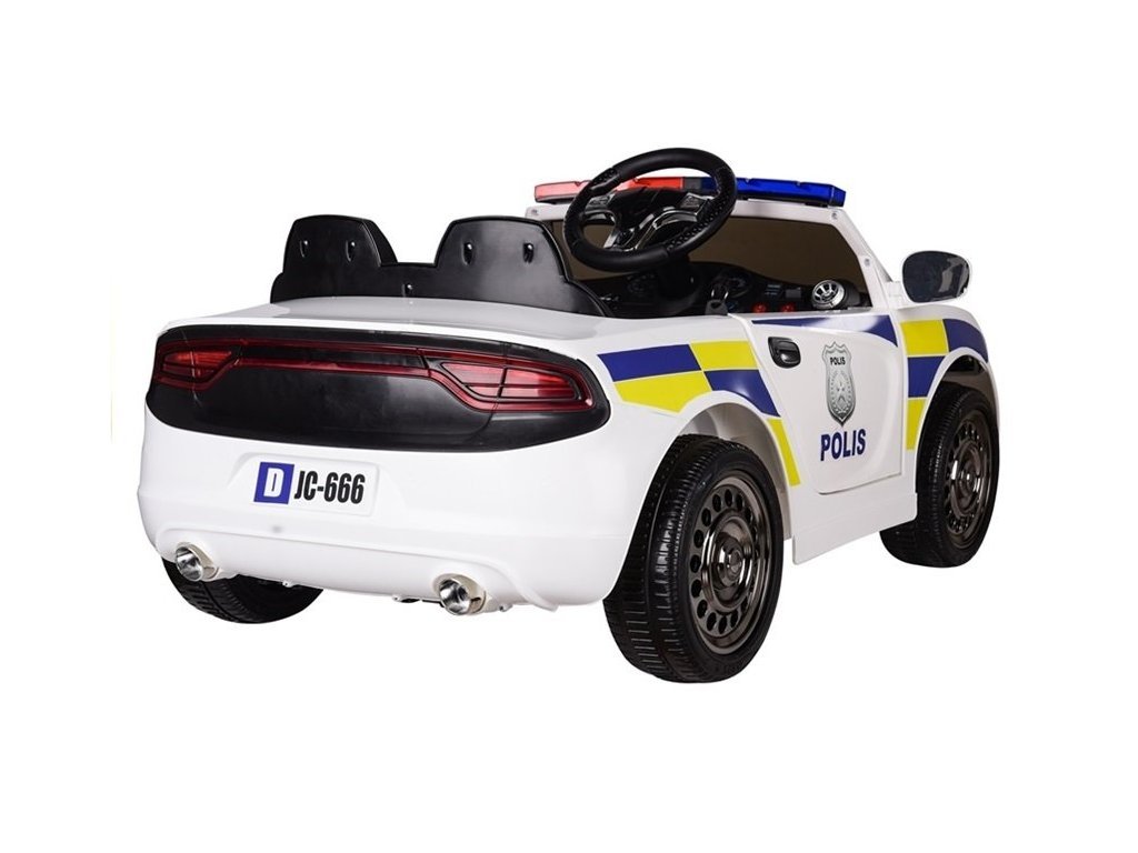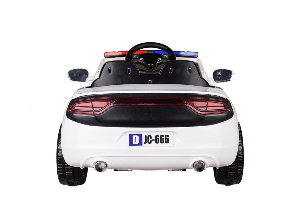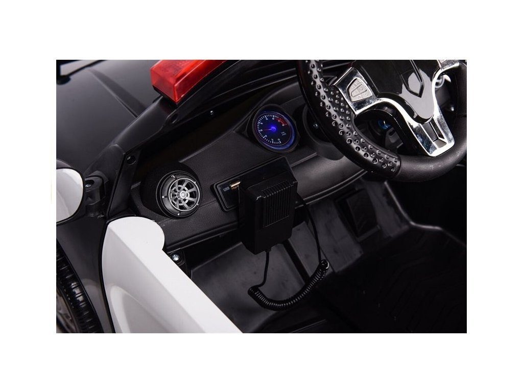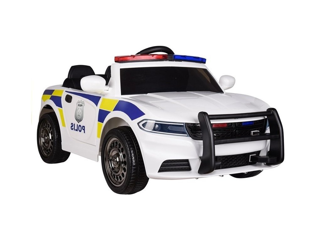 Prezentirano bijelo vozilo na akumulator privlači pažnju izdaleka. Bijela karoserija prekrivena je brojnim naljepnicama u kontrastnim bojama, čiji je uzorak u skladu s policijskom stilizacijom. Uključen je natpis POLICE i slike koje podsjećaju na pravi policijski bedž. To nije sve – plava i crvena svjetla postavljena su iznad okvira zatamnjenog vjetrobranskog stakla, što će sigurno izmamiti širok osmijeh na licu svakog djeteta.