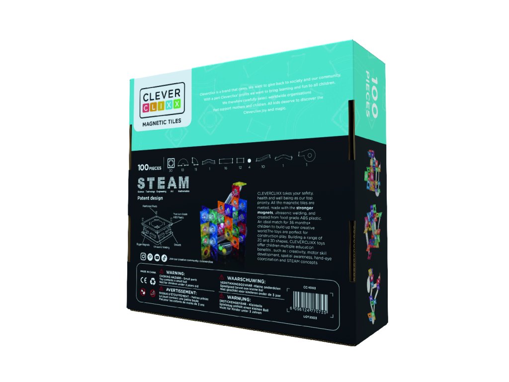 Otkrijte čaroliju svjetlosne igre uz Cleverclixx magnetski set za gradnju! Ova jedinstvena kuglasta staza kombinira popularnu magnetsku konstrukciju s LED efektom - posebne kuglice svijetle dok se kreću, stvarajući nevjerojatan svjetlosni show. Što se brže kotrlja, to jače sjaji. Nakon što se zaustave, automatski se isključe – i avantura može početi iznova.