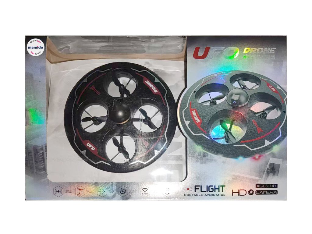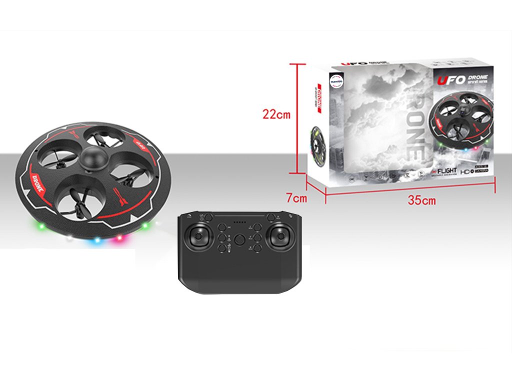 Okrugli dizajn nalik na NLO, četiri propelera skrivena unutar zaštitnog okvira – idealno za sigurno letenje kod kuće i vani. Upravljanje se vrši putem daljinskog upravljača, dron je stabilan, jednostavan za upravljanje i zahvaljujući LED svjetlima efektno svijetli tijekom leta. Izvrstan za početnike, djecu ili kao zabavna RC igračka za popodnevno igranje.