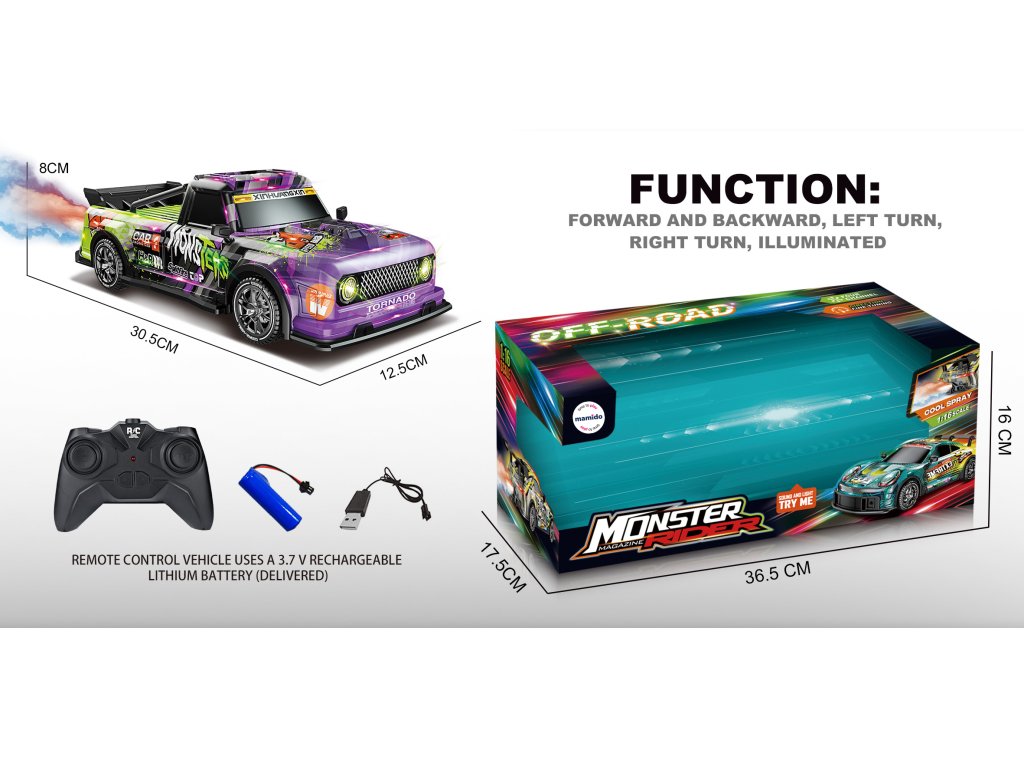 Auto se upravlja preko daljinskog upravljača i savladava vožnju naprijed, nazad, skretanje lijevo i desno. Idealan za sve male i veće ljubitelje driftanja i trkaćih automobila.