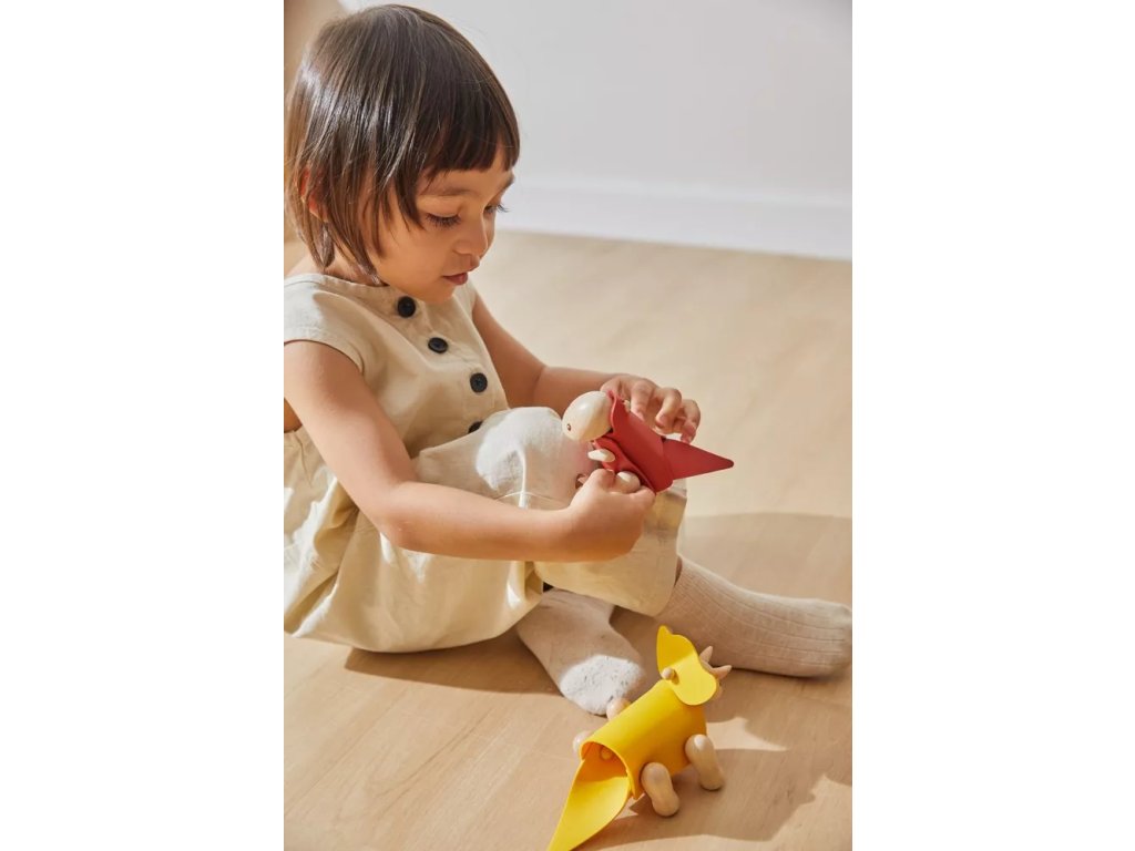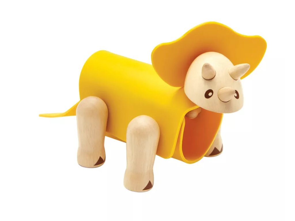 Pretvoriva drvena igračka Triceratops, koju čini kombinacija drvenih i gumenih dijelova. Može se nadopuniti materijalima prema vlastitoj mašti; dio seta je i kartica koja povezuje učenje i igru.