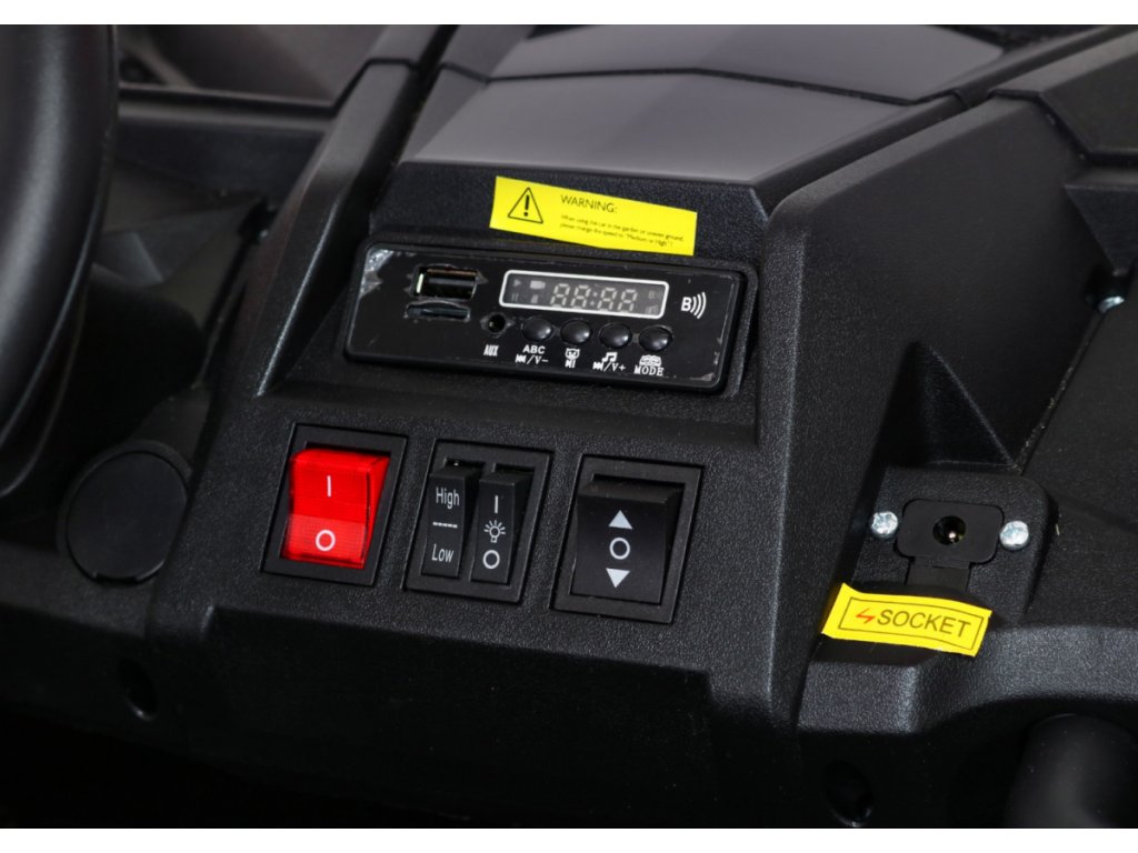 Unutrašnjost je opremljena podesivim sjedalom od ekološke kože, glazbenim panelom s ulazima MP3, AUX, USB i Bluetooth. Prilikom paljenja vozila čuju se zvukovi motora. Na upravljaču se nalaze tipke sa zvučnim efektima.