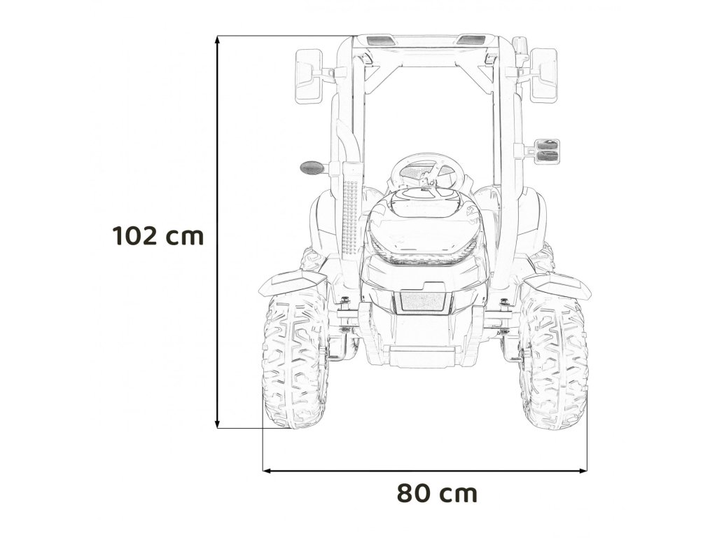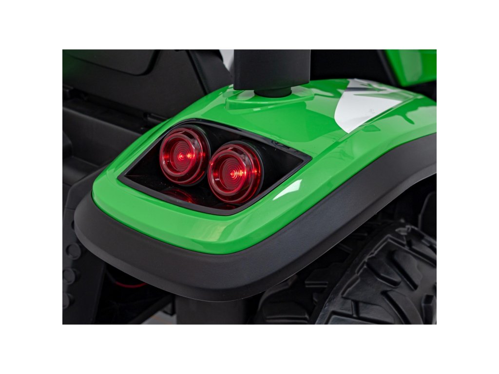 Dječji električni traktor s prikolicom ima dva vrlo snažna motora od 200W i bateriju kapaciteta 24V 7Ah. Traktor ima prednja i stražnja LED svjetla te glazbeni panel s USB, MP3 i Bluetooth ulazom. Maksimalna nosivost traktora je 30 kg .
