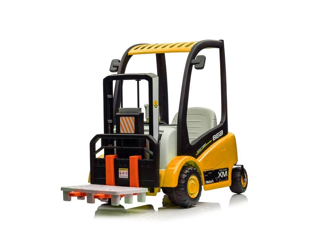 Dječji električni viličar opremljen je s dva motora ukupne snage 90W i širokim kotačima.