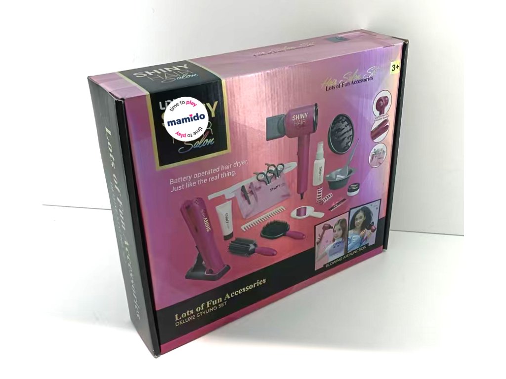 Postani prava frizerka uz kompletni set Shiny Hair Salon! Ovaj luksuzni set za oblikovanje donosi realistično iskustvo salona ljepote – uključuje funkcionalni sušilo za kosu na baterije koje ispuhuje zrak i peglu za kosu sa svjetlosnim efektom. Zahvaljujući bogatom priboru, djeca mogu stvarati beskrajne frizure i vježbati svoju kreativnost i finu motoriku.