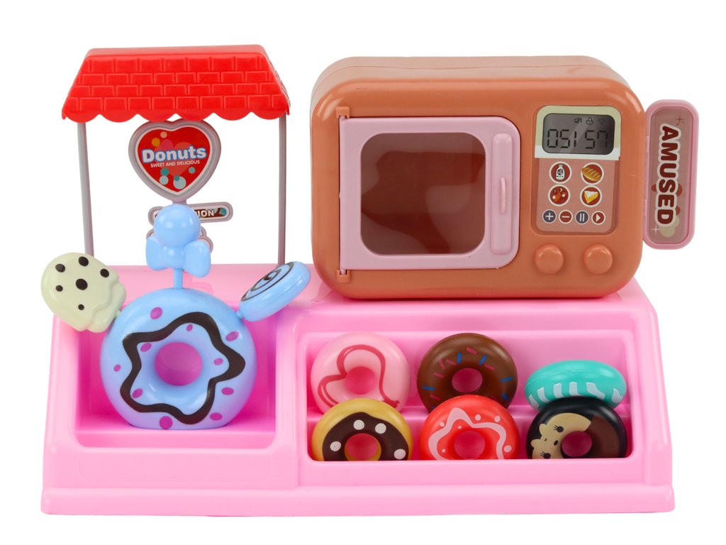 Na štandu s krafnama, izrađenom s naglaskom na detalje, nalazi se mikrovalna pećnica za grijanje krafna, što dodaje autentičnost i realizam. Krafne, koje se mogu postaviti na police, raznolike su i primamljive, potičući djecu na kreativnu igru i posluživanje kupaca.