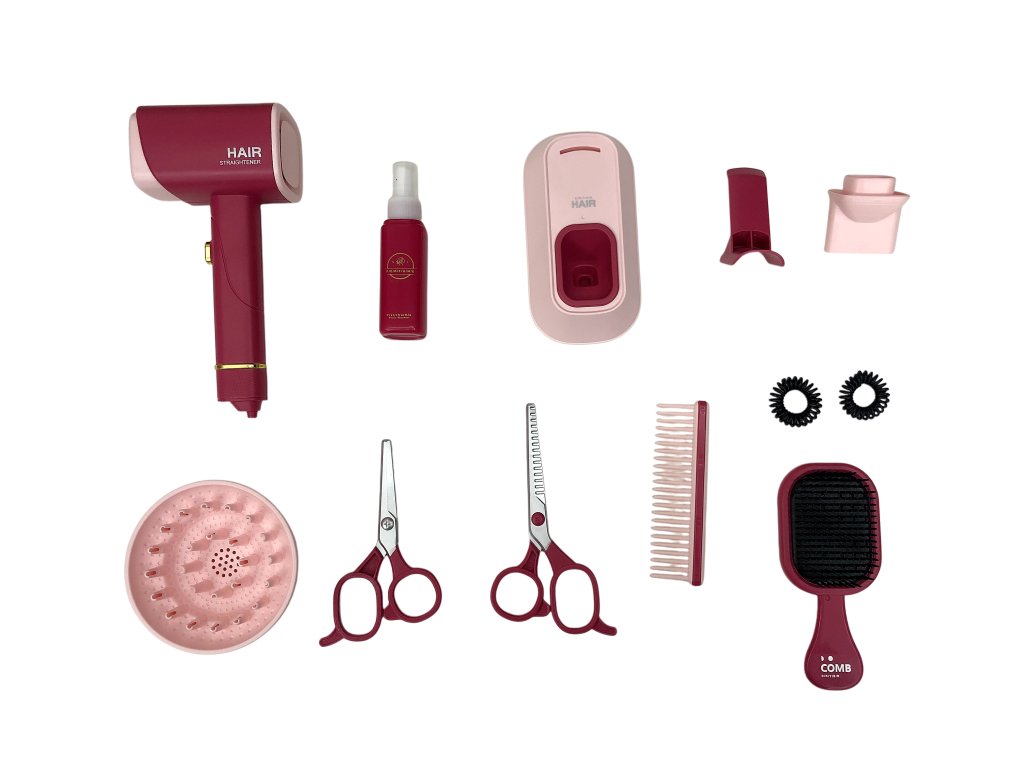 - Sadrži: sušilo za kosu sa zvukom i svjetlom, škare, češljeve, bočicu, gumice i druge dodatke