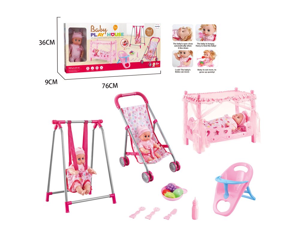 Ova je garnitura potpuni set za igru brige o bebi – dijete može uspavljivati lutku u krevetiću s baldahinom, voziti je u šetnju u kolicima, ljuljati je na ljuljački, hraniti i brinuti se o njoj pomoću priloženih dodataka. U pakiranju je lutka koja zatvara oči kada se položi i ima pokretne udove. Izvrsna igračka za razvoj mašte, socijalnog poimanja i igranja uloga. Igračka je prikladna za djecu od 3 godine.