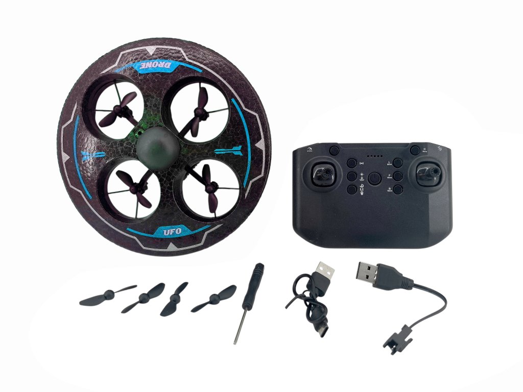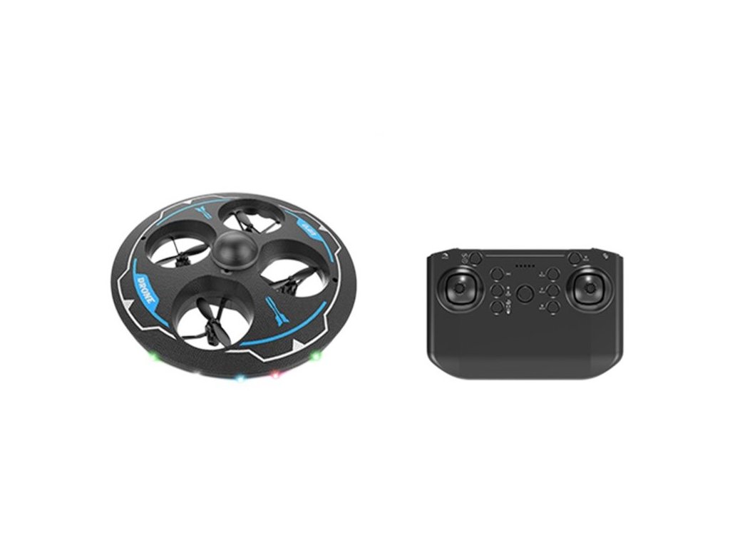 Okrugli dizajn nalik na NLO, četiri propelera skrivena unutar zaštitnog okvira – idealno za sigurno letenje kod kuće i vani. Upravljanje se vrši putem daljinskog upravljača, dron je stabilan, jednostavan za upravljanje i zahvaljujući LED svjetlima efektno svijetli tijekom leta. Izvrstan za početnike, djecu ili kao zabavna RC igračka za popodnevno igranje.