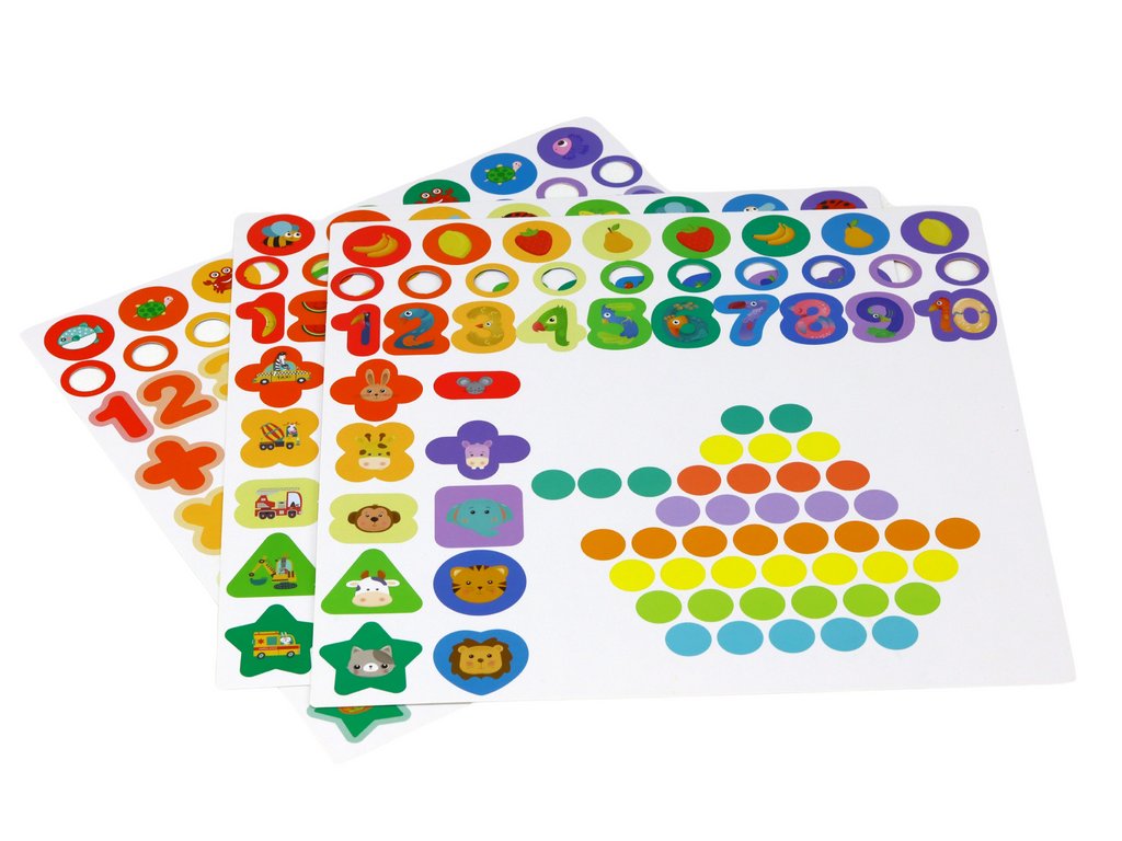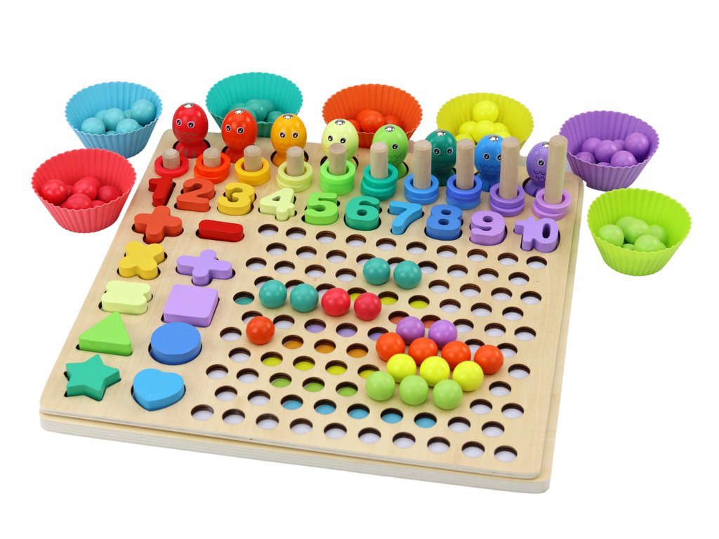 Set se sastoji od mnogo elemenata, kao što je pecanje ribica pomoću štapa s magnetom, postavljanje kuglica na pravo mjesto, stavljanje odgovarajućeg broja prstenova na različite štapiće te slaganje prostornih oblika. Na taj način dijete ima priliku vježbati razne vještine, poput prepoznavanja oblika, brojanja, prilagođavanja i razvoja motoričkih sposobnosti te koordinacije oko-ruka.
