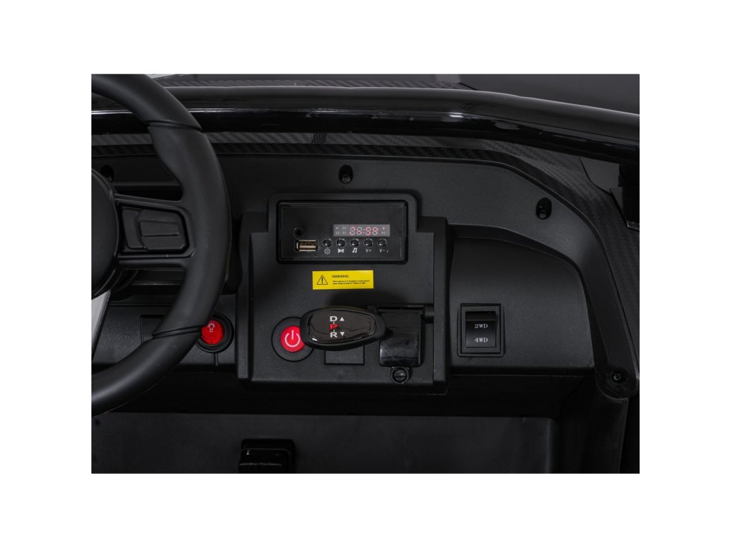 Dva odvojena sjedala od eko kože opremljena su sigurnosnim pojasevima i omogućuju istovremenu vožnju dvoje djece. Otvaranje vrata sa sigurnosnim bravama osigurava jednostavno i sigurno ukrcavanje. LED svjetla sprijeda i straga , realistični zvukovi motora i drugi audio efekti donose autentično iskustvo vožnje. Multimedijska ploča omogućuje spajanje putem USB-a, AUX-a i MP3-a, a tu su i FM radio i tipke za upravljanje na upravljaču.