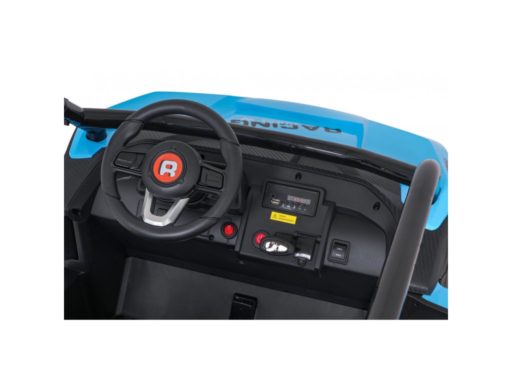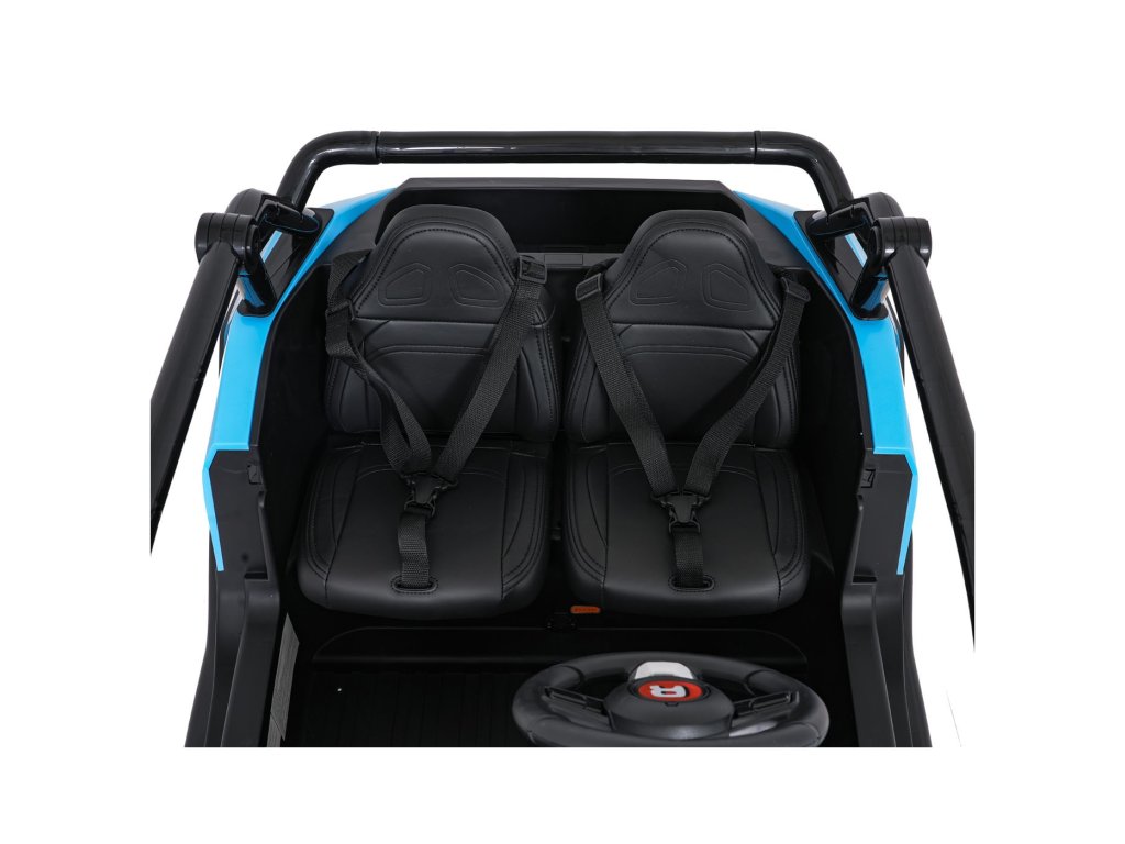 Dva odvojena sjedala od eko kože opremljena su sigurnosnim pojasevima i omogućuju istovremenu vožnju dvoje djece. Otvaranje vrata sa sigurnosnim bravama osigurava jednostavno i sigurno ukrcavanje. LED svjetla sprijeda i straga , realistični zvukovi motora i drugi audio efekti donose autentično iskustvo vožnje. Multimedijska ploča omogućuje spajanje putem USB-a, AUX-a i MP3-a, a tu su i FM radio i tipke za upravljanje na upravljaču.