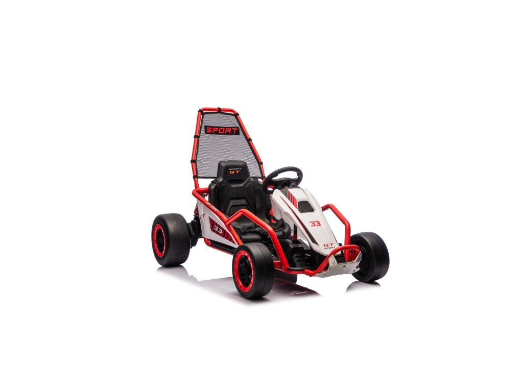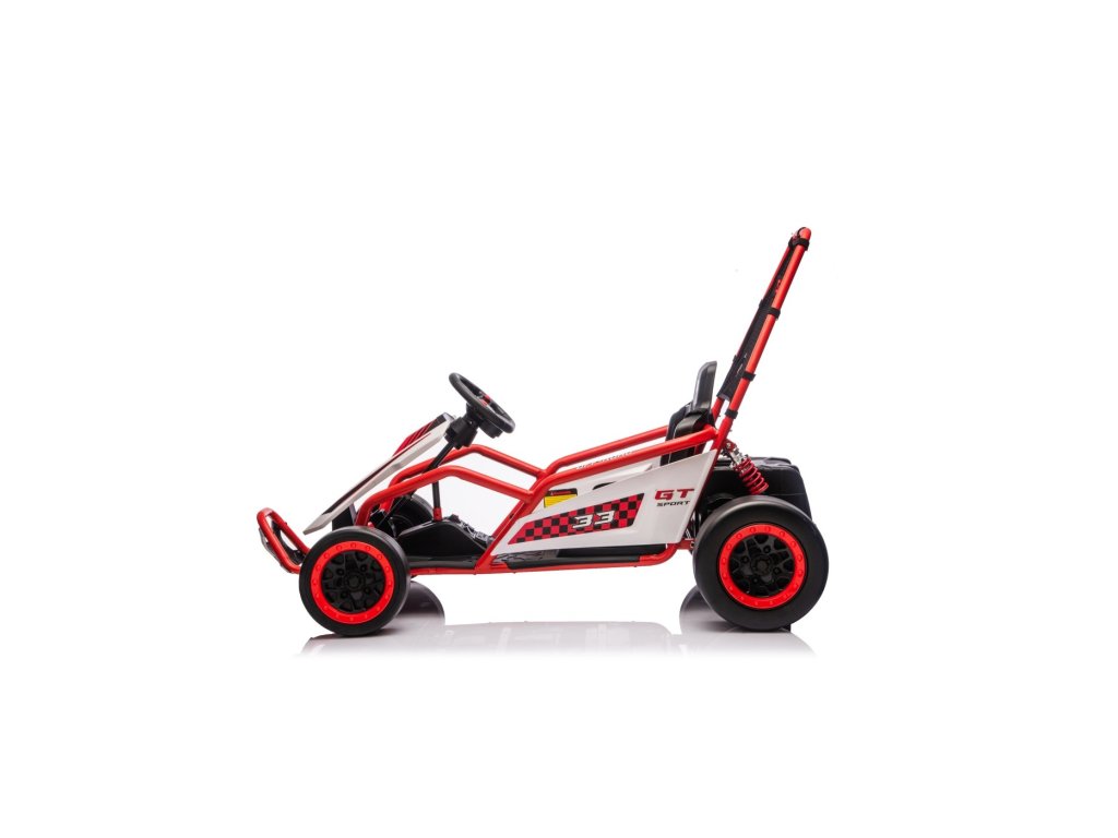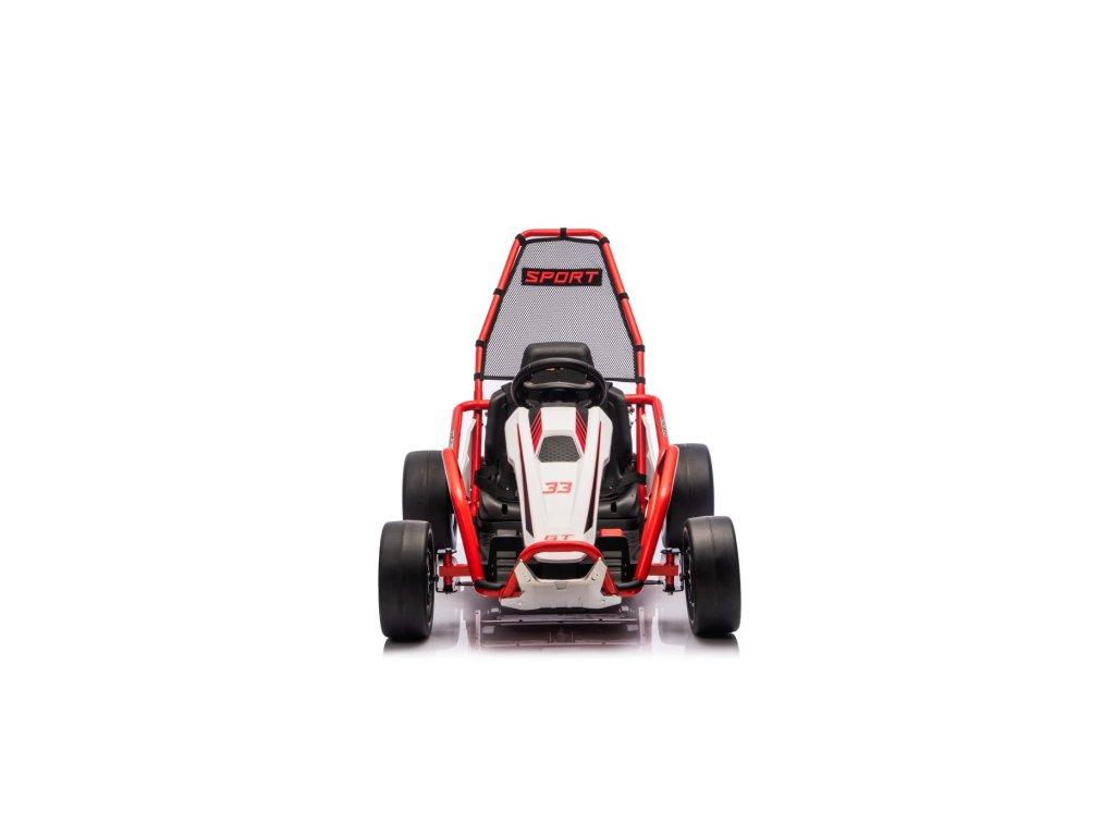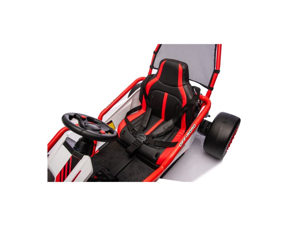 Gokart je opremljen prednjim EVA kotačima za glatku vožnju, dok stražnji plastični kotači omogućuju jednostavno driftanje. Naravno, tu su i podesivi stražnji amortizeri, glatki start i sigurnosni pojasevi za veću sigurnost tijekom vožnje. Sve upotpunjuje moderni audio panel s Bluetoothom i MP3 playerom.