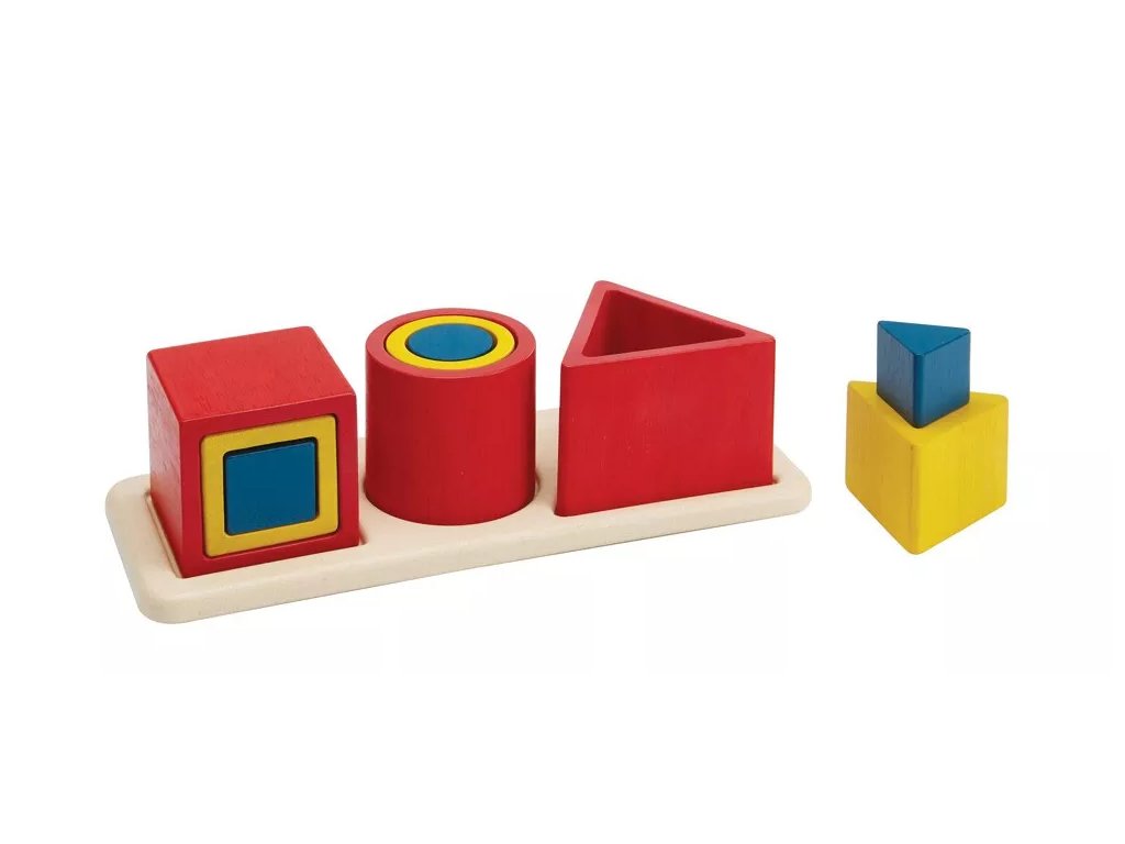 Set sadrži tri vrste šupljih geometrijskih blokova: kocku, valjak i trokut. Djeca s njima istražuju prostorne odnose, razvijaju rane matematičke vještine, koordinaciju oko-ruka i sposobnost rješavanja problema pri uspješnom dovršetku umetaljke. Oblici se mogu slagati, umetati i kombinirati na različite načine.