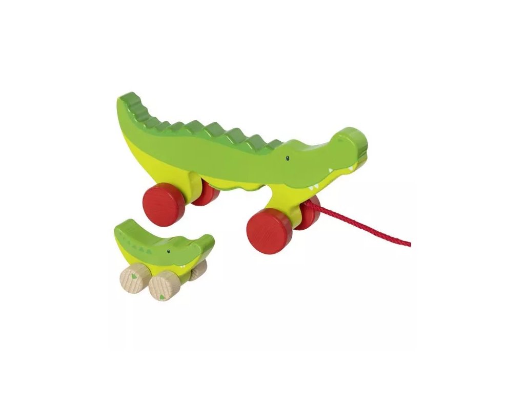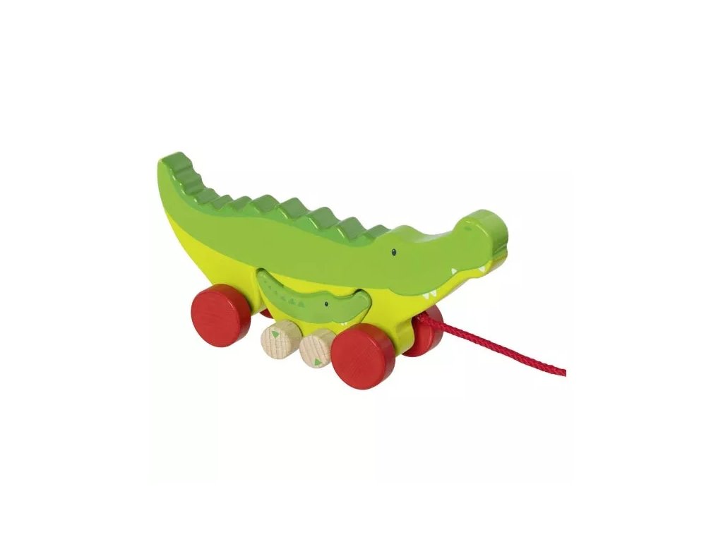 Drvena igračka za povlačenje sastavljena od dva povezana dijela — odraslog krokodila i mladunčeta. Dijelovi se mogu odvojiti i koristiti zasebno, svaki ima svoje kotače i može se vući ili gurati.