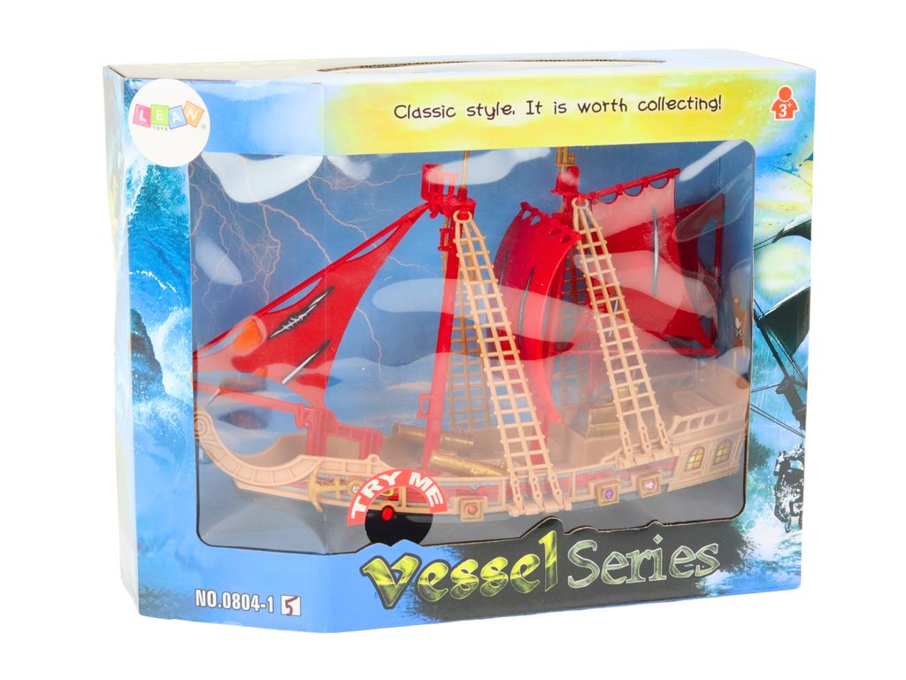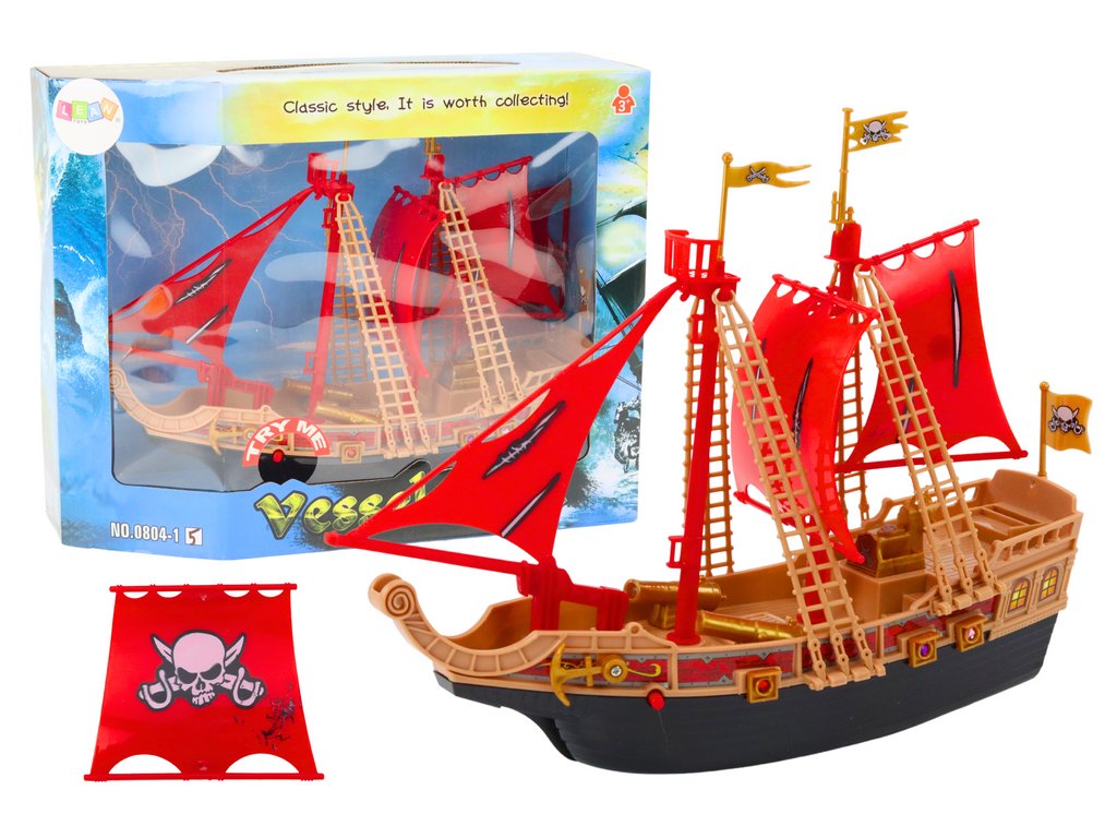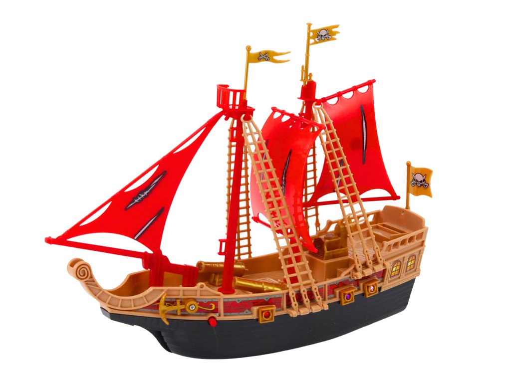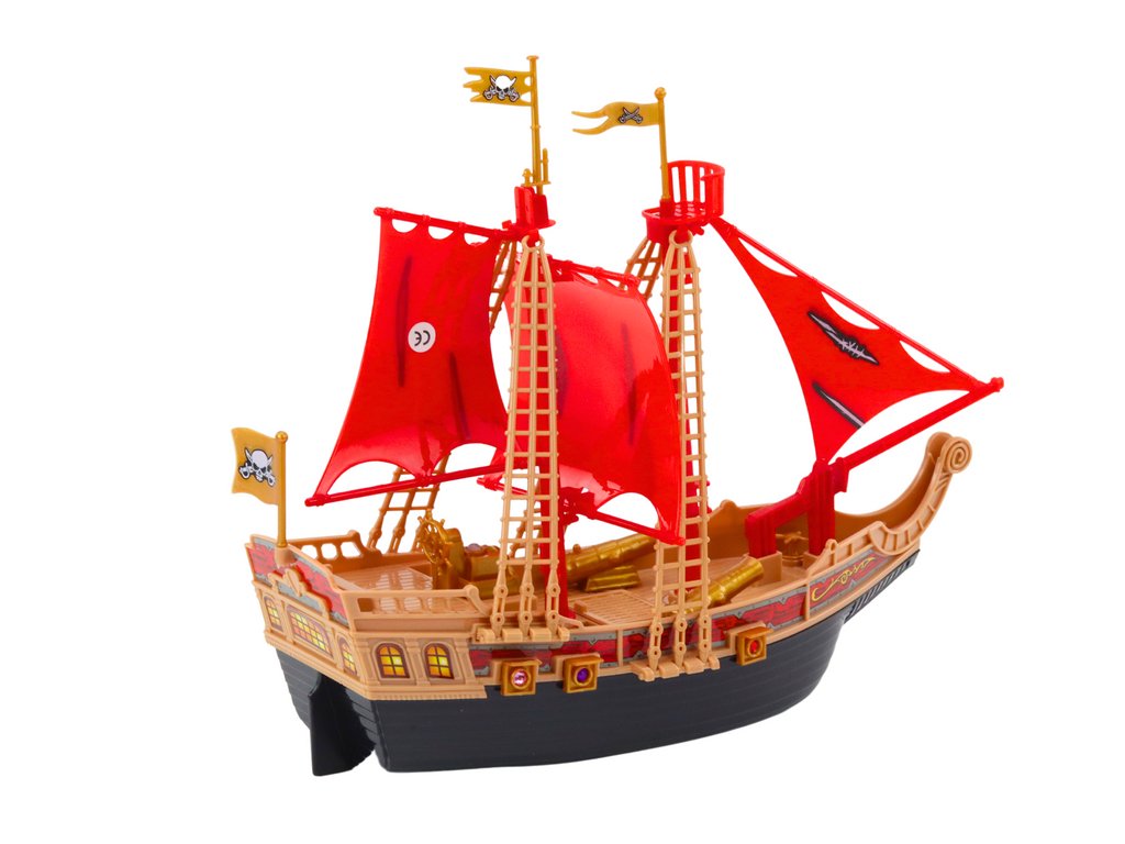 Brod se ističe crnim pramcem koji mu daje prijeteći i autentičan izgled dostojan pravih gusarskih brodova iz davnine. Obogaćen crvenim jarbolima na kojima vijore gusarski simboli, privlači pažnju i dodaje atmosferu tajanstvenih morskih avantura. Ovi detalji čine igračku pravim brodom, spremnim za osvajanje mora i oceana.