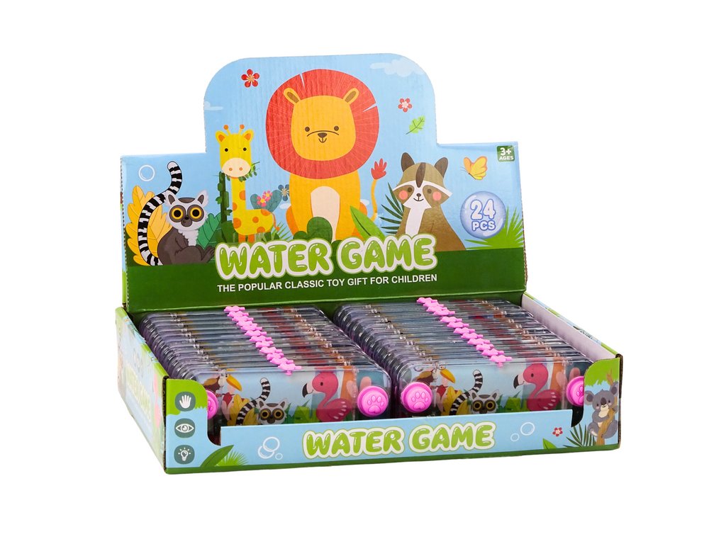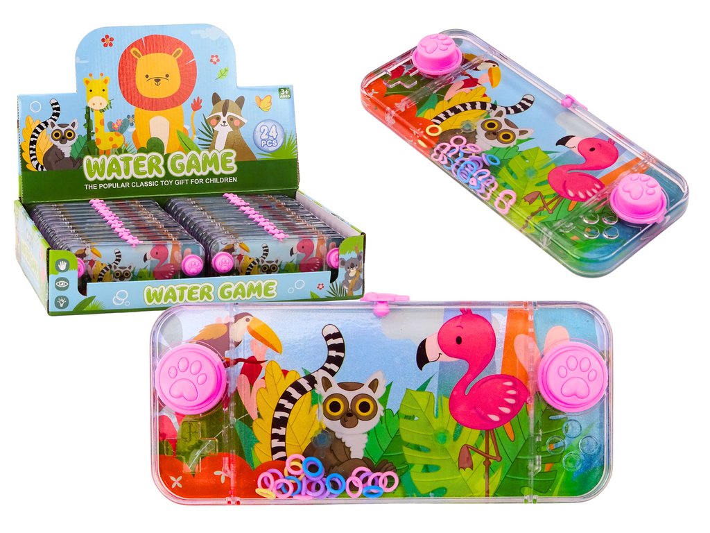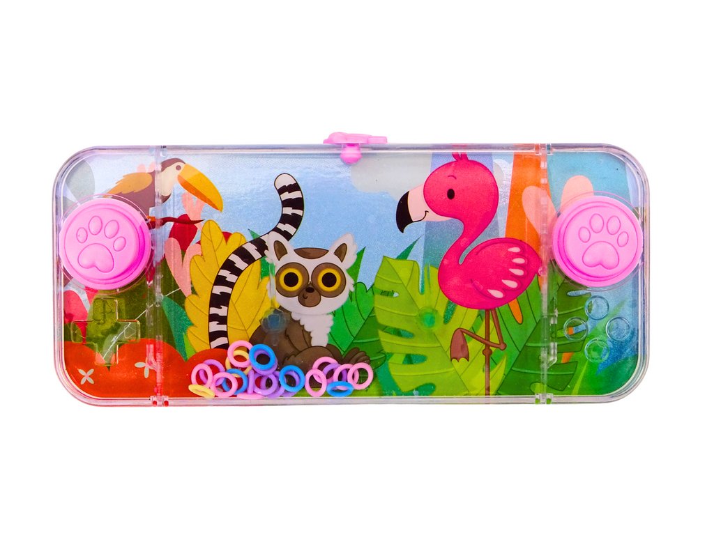 Ovo je klasična vodena igra spretnosti s motivima plamenca i lemura, često viđena u obliku male, pravokutne igračke. Mehanizam je jednostavan, ali vrlo privlačan. Igra ima pravokutni oblik, što je čini udobnom za držanje u rukama. S desne i lijeve strane uređaja nalaze se dva ružičasta gumba ukrašena šapama životinja. Ovi gumbi su ključni za igru i lako dostupni igračevim prstima.