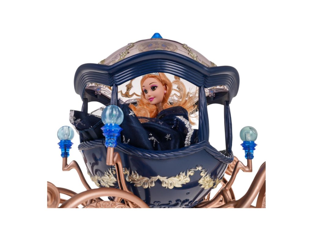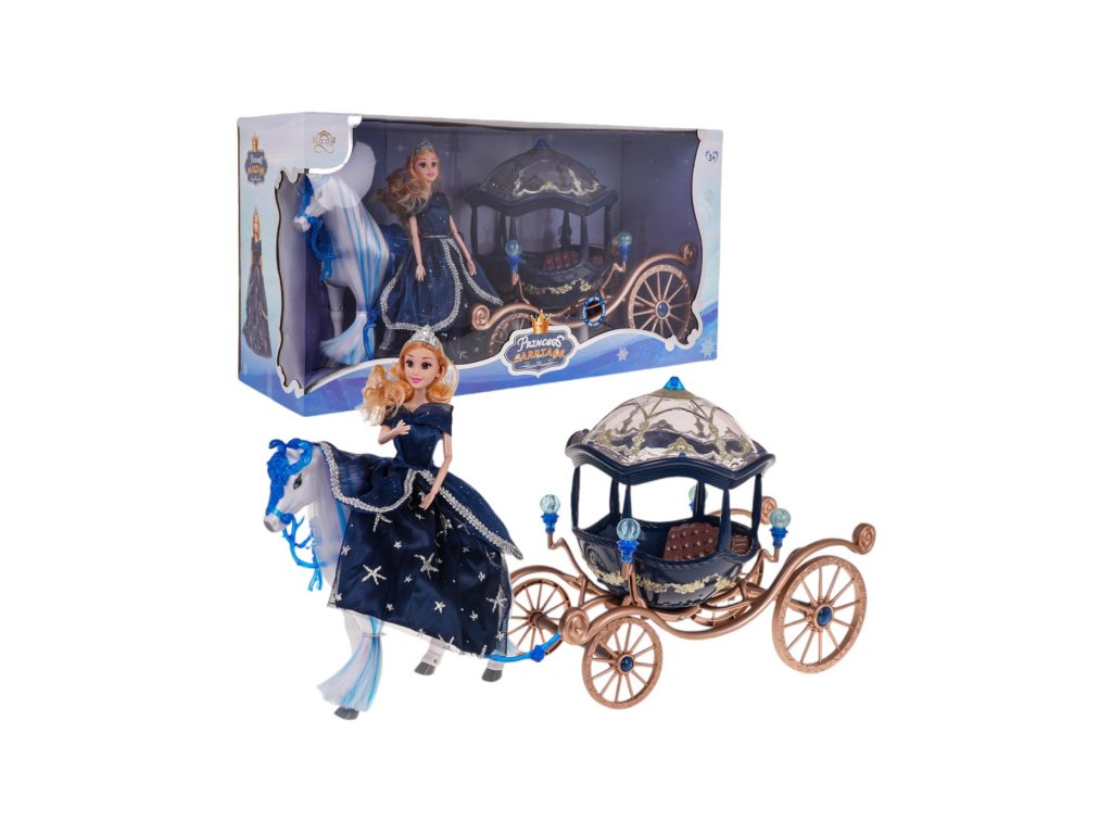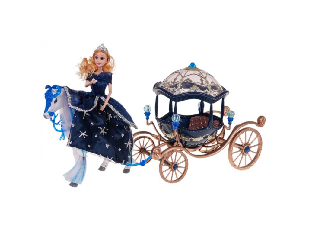 Set lutke, konja i kočije sa svjetlosnim i zvučnim efektom za djecu od 3 godine . Set vam omogućuje da se prebacite u svijet magije. Konj se kreće naprijed i ispušta zvukove poput prave životinje. Vagon je osvijetljen trepćućim svjetlima (plavim i crvenim). Lutka ima pokretne ruke i noge, prekrasnu maturalnu haljinu i dugu kosu.