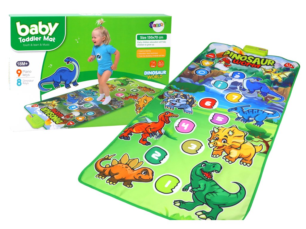 Interaktivna plesna i edukativna glazbena podloga s motivom dinosaura potiče djecu na ples, istovremeno razvijajući njihovu kreativnost i aktivnost. Ukrašena prekrasnim šarenim slikama dinosaura, nije samo sjajna igračka, već i šarmantan ukras dječje sobe. Posebni senzori reagiraju na pokrete djeteta, što mu omogućuje da se potpuno interaktivno uključi u igru. Podloga ima ugrađene zvučne efekte i melodije koje stvaraju atmosferu tijekom plesa i igre.