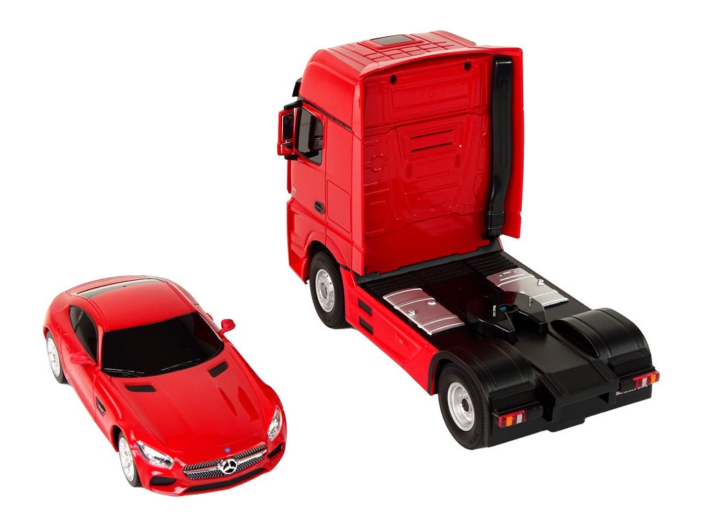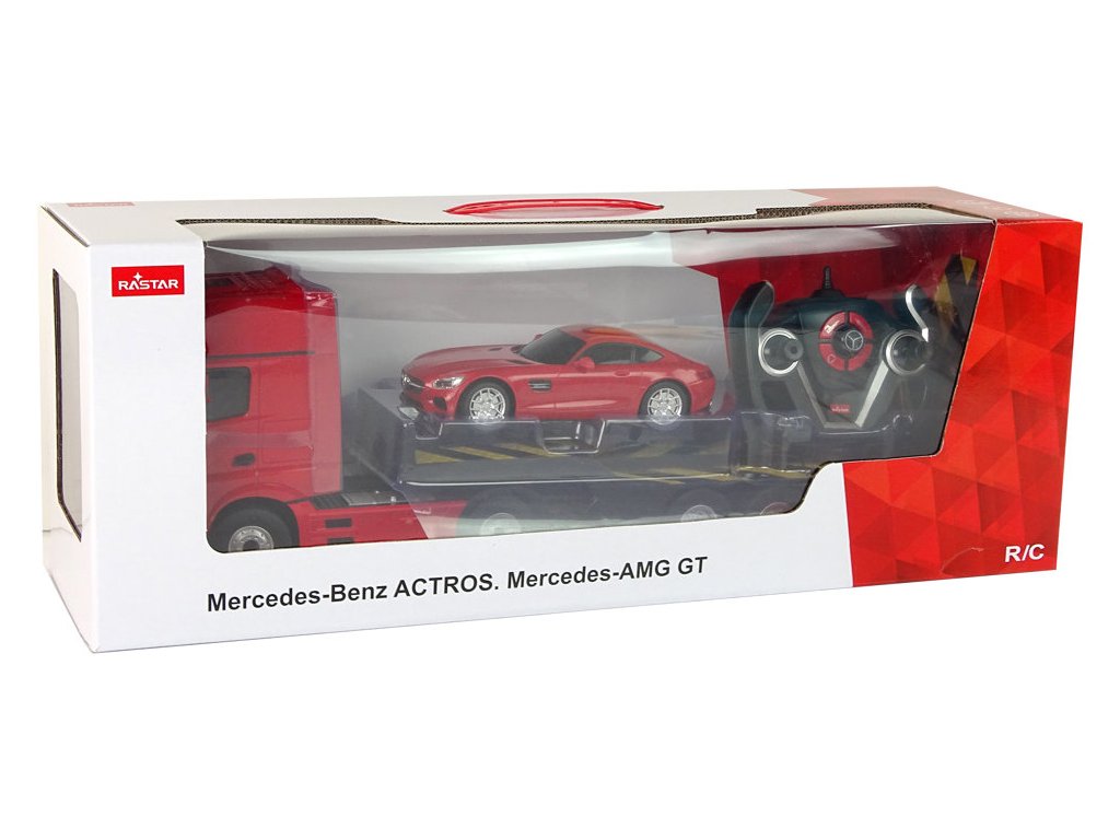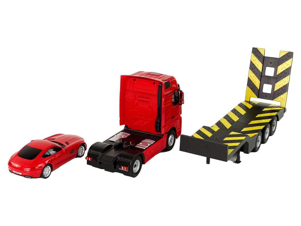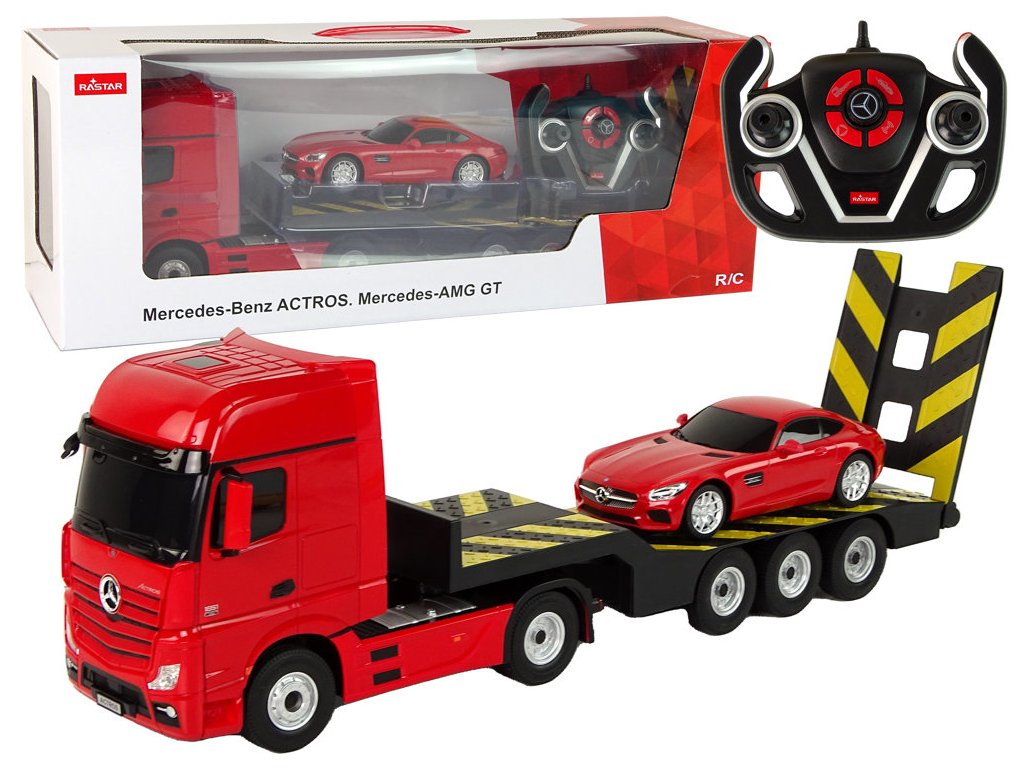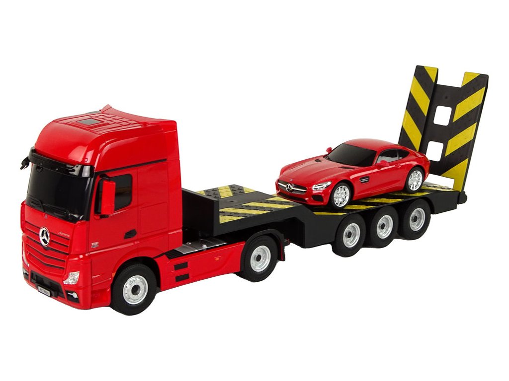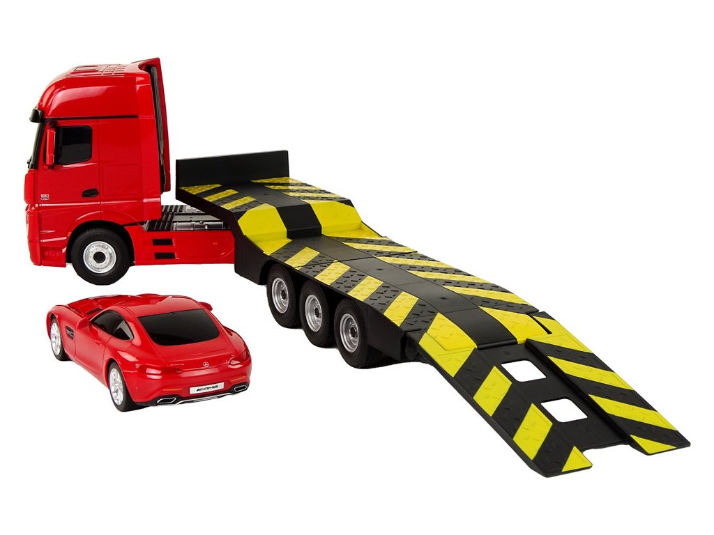 Prilikom prijevoza teških vozila bit će korisno ovo prekrasno kamionsko vozilo s prikolicom marke Mercedes-Benz. Zahvaljujući daljinskom upravljanju na frekvenciji od 2,4 GHz, možete upravljati kamionom i priloženim autićem. Cijeli set izrađen je od plastike, a kamion i prikolica imaju gumene kotače. Kamion je također opremljen svjetlima koja svijetle tijekom vožnje.
