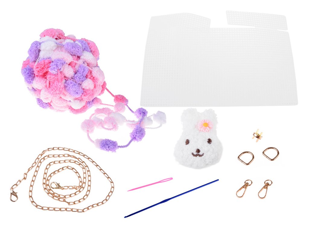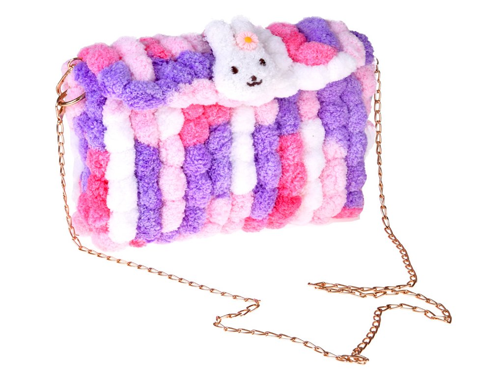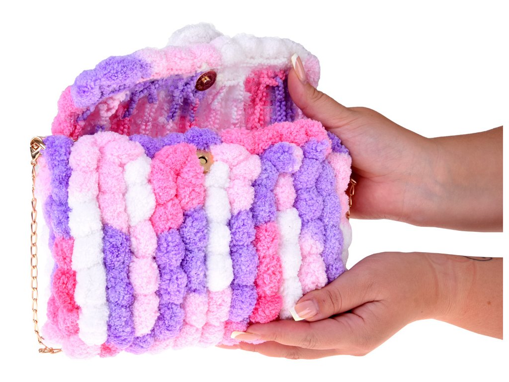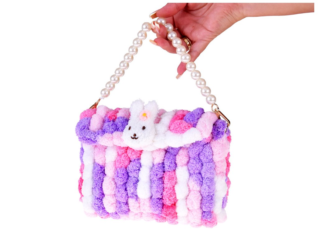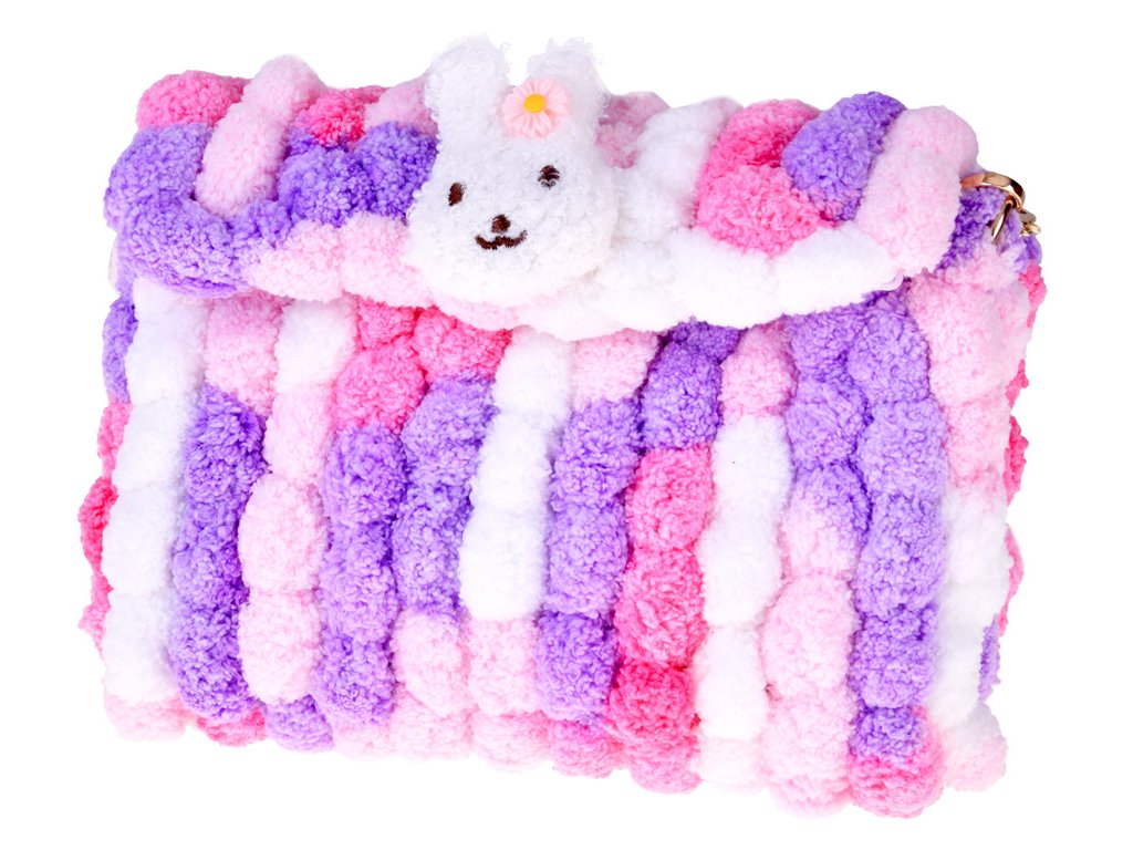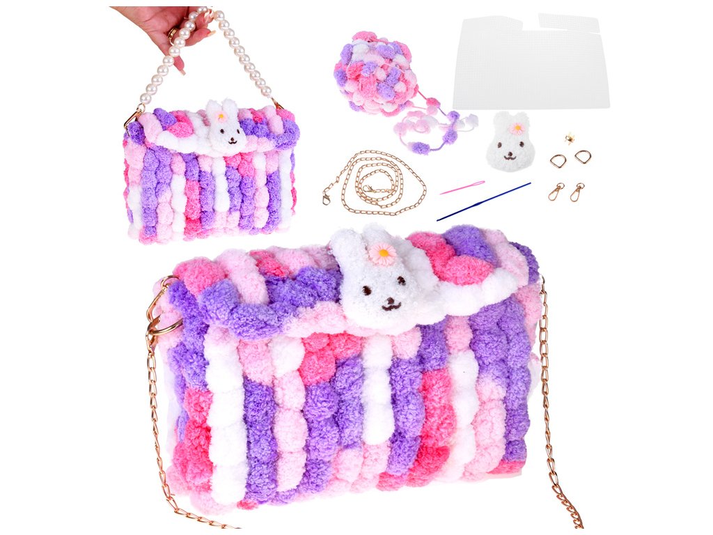 - Sadrži meke, šarene pređe sa šarenim pomponima od kojih nastaje slatka torba.