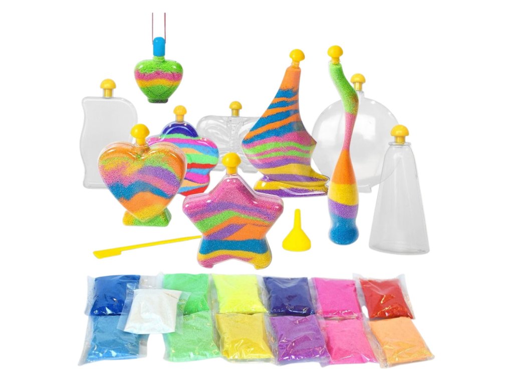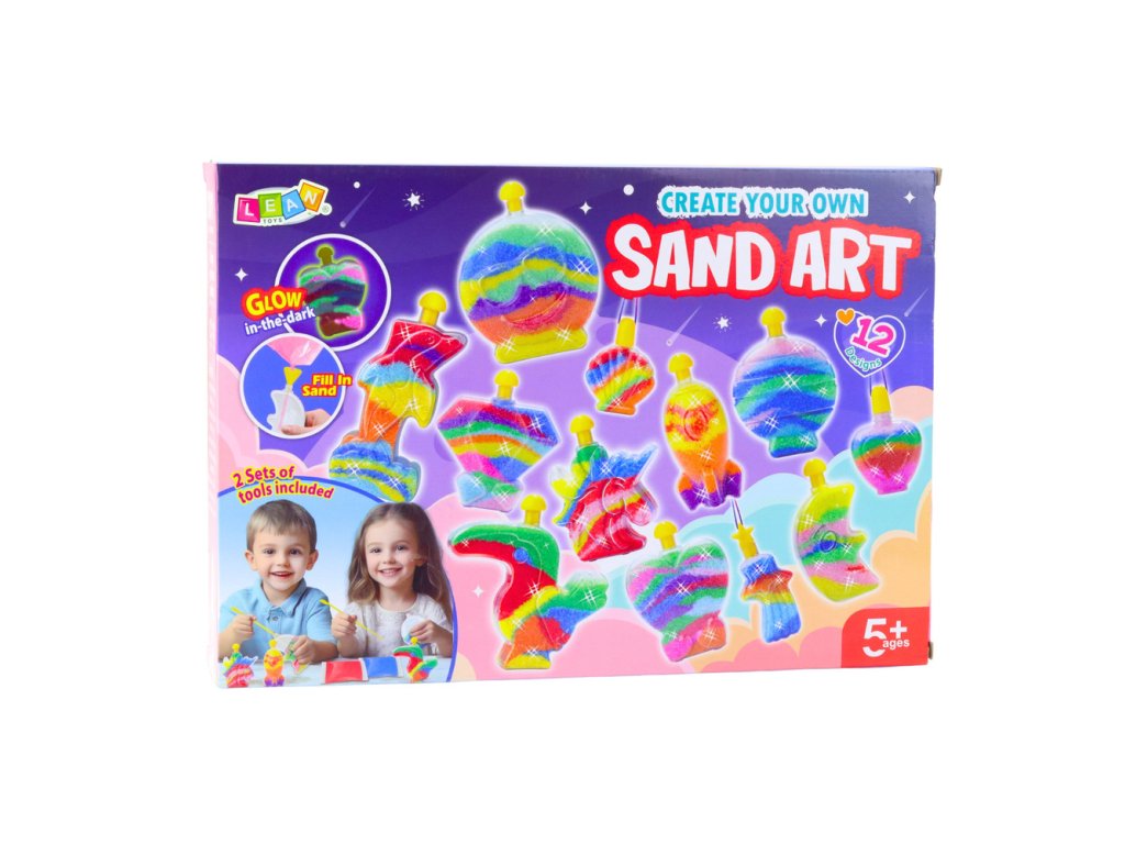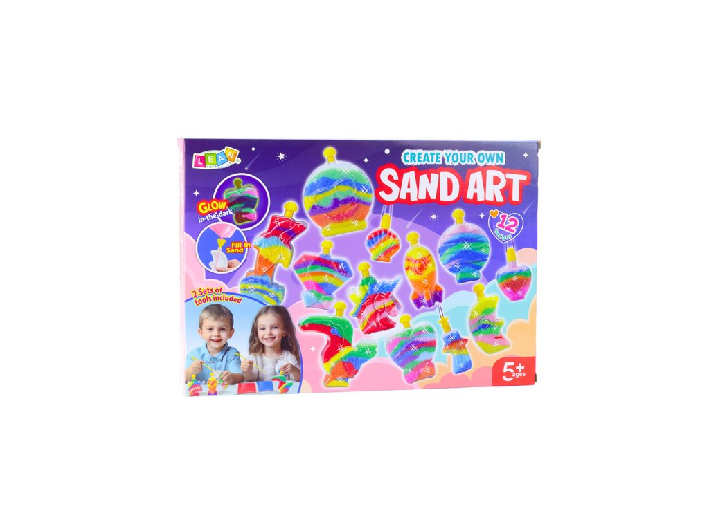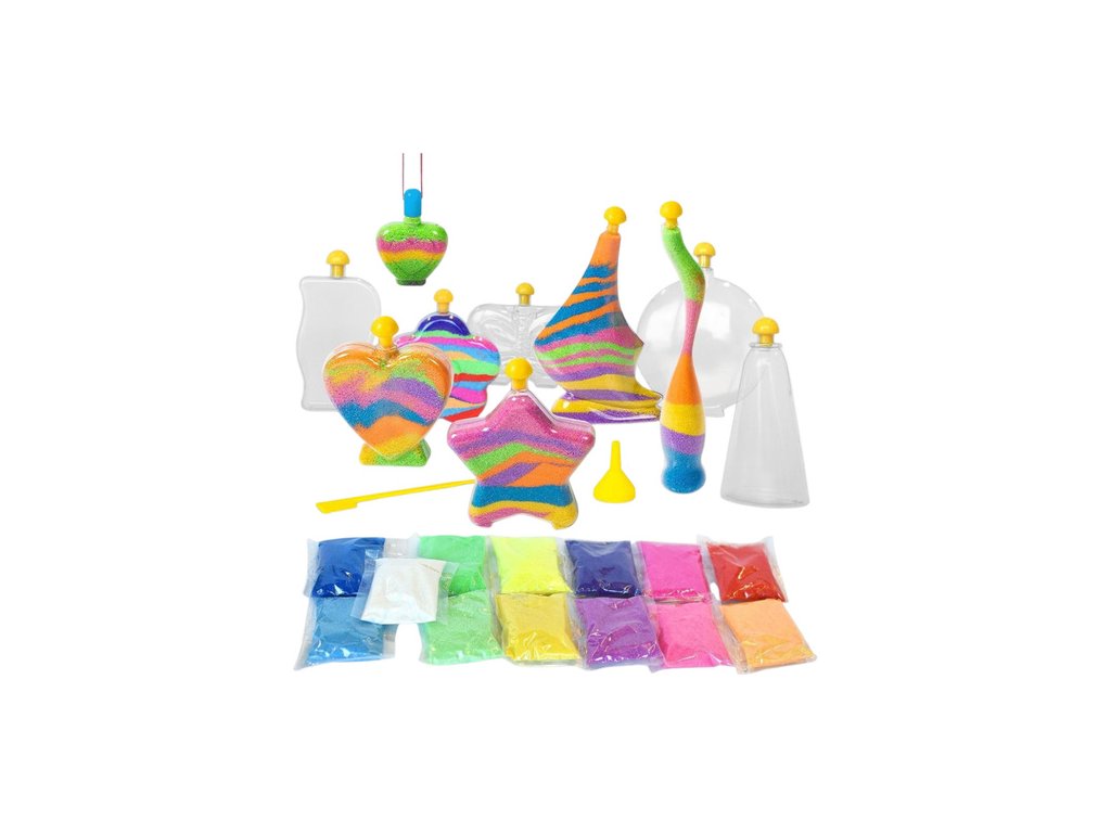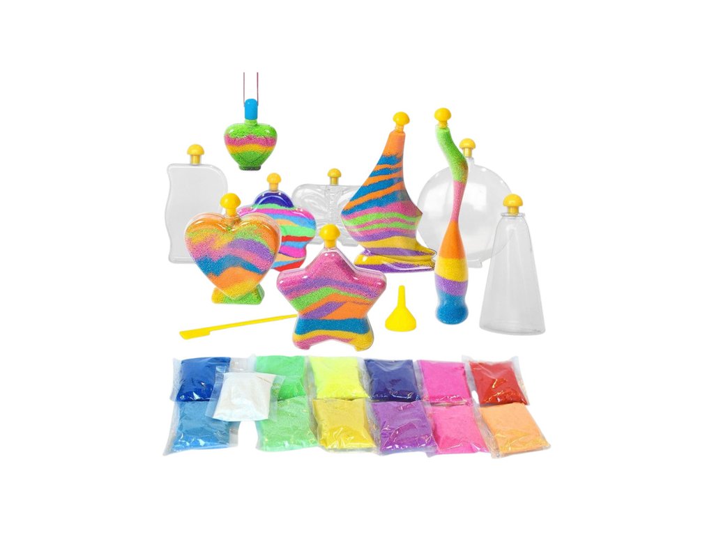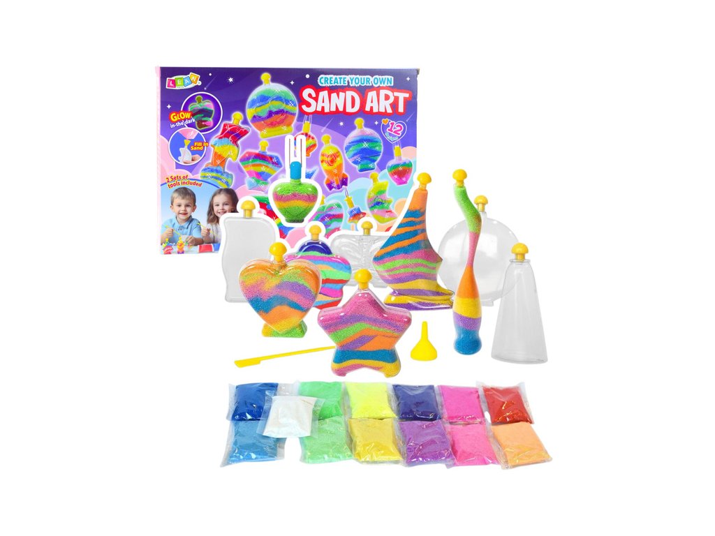 Set Čarobni svjetleći pijesak idealan je za djecu koja vole kreativnu i maštovitu igru. Omogućuje maloj djeci da stvaraju vlastite jedinstvene ukrase punjenjem posuda obojenim pijeskom prema vlastitoj mašti. Set uključuje do 12 posuda različitih oblika koje se mogu puniti i ukrašavati na mnogo načina. Krajnji rezultat je prekrasan i originalan ukras koji može ukrasiti dječju sobu ili postati jedinstven poklon za voljene osobe.
