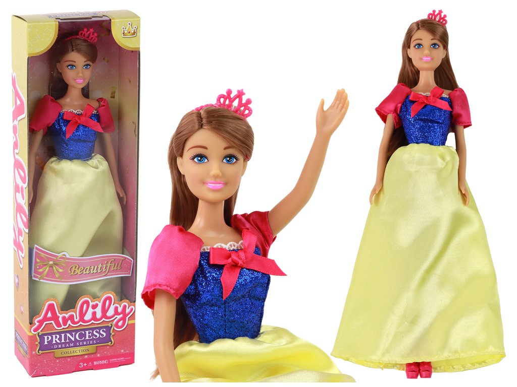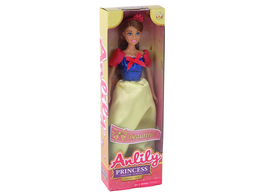 Lutka Anlily princeza s dugom tamnom kosom i žutom haljinom je čarobna lutka koja će vaše dijete uvesti u svijet bajki. S dimenzijama 30 cm x 7 cm x 4 cm, ova lutka sja ljepotom i stilom. Njezine plave oči i duga tamna kosa (idealna za češljanje) dodaju liku šarm.