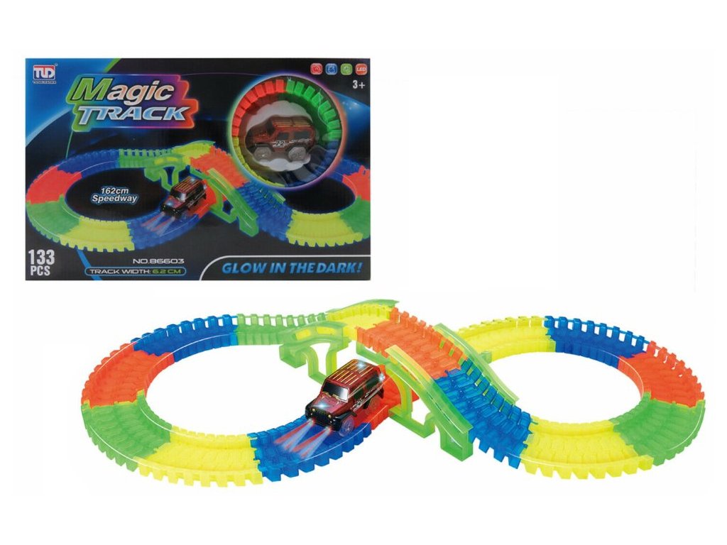 Magic Track svjetleća staza za autiće 133 dijelova: Doživite avanturu s našom fascinantnom stazom! S ovim setom dobivate ukupno 133 dijela i kompletnu garnituru tračnica uključujući mostove. Budite kreativni i sastavite stazu prema vlastitoj mašti - bilo u obliku broja osam ili na bilo koji drugi način.