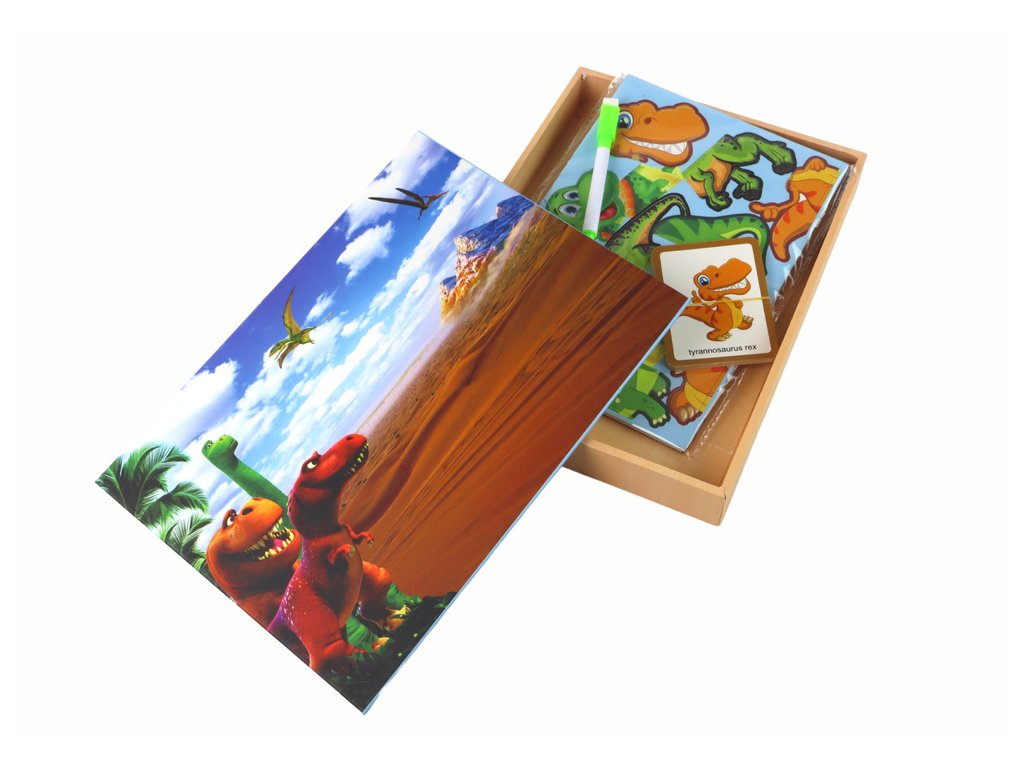 Na poklopcu kutije prikazano je prapovijesno mjesto gdje djeca mogu stvarati vlastite priče. Osim toga, druga strana ploče služi kao površina za crtanje s priloženim markerom, što djeci omogućuje izražavanje kroz umjetnost.