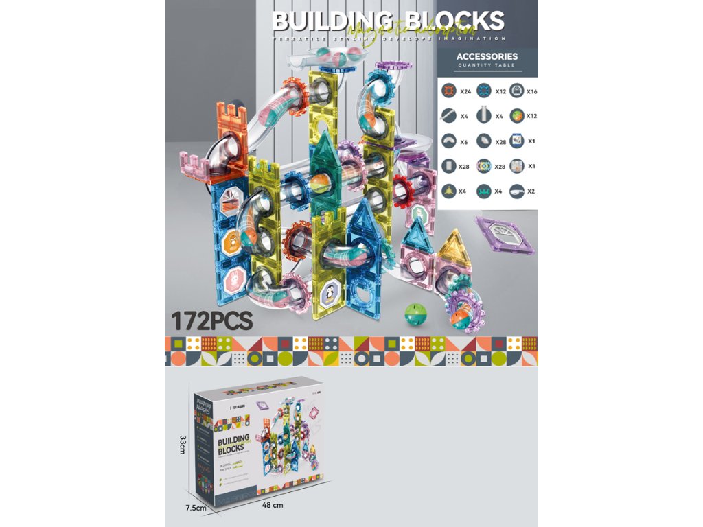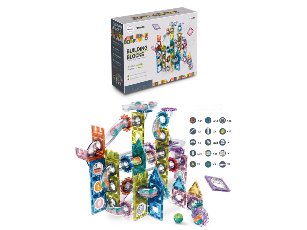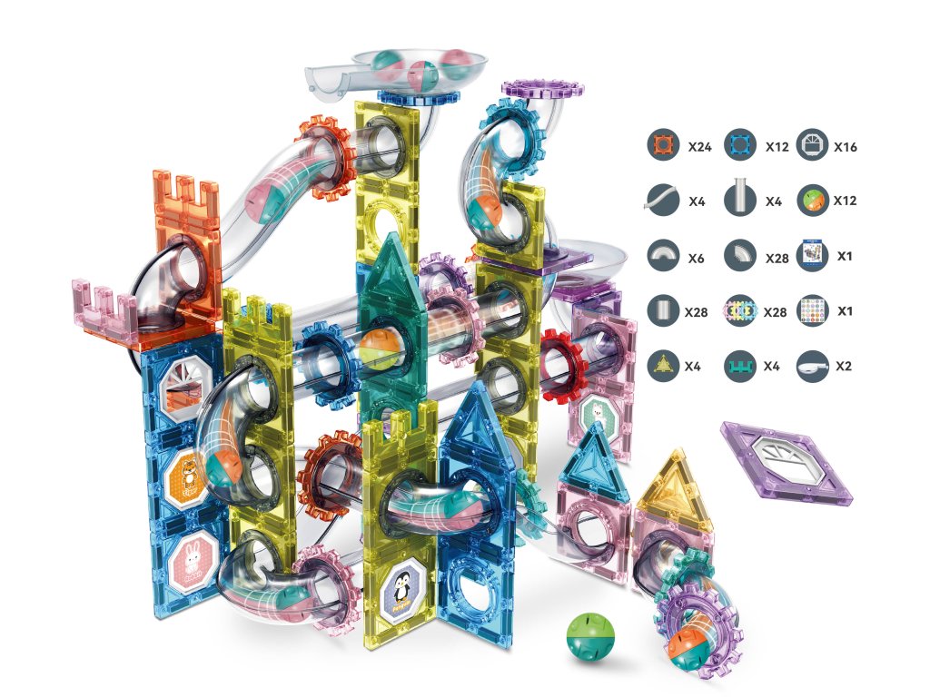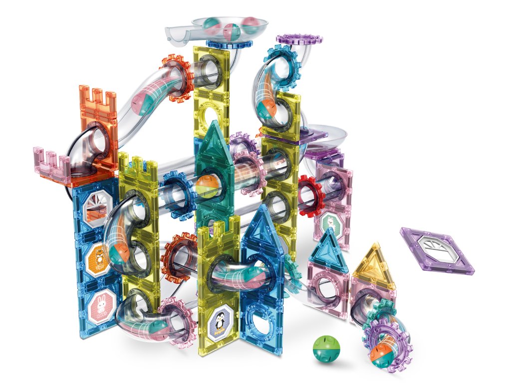 Fantastična magnetska slagalica koja spaja kreativno građenje s dinamičnom stazom za kuglice! Set sadrži 172 dijela različitih oblika, prozirnih cijevi, lukova, kotača i magnetskih ploča, zahvaljujući kojima djeca mogu stvarati vlastite šarene konstrukcije i promatrati kako kuglice prolaze njihovom originalnom stazom.