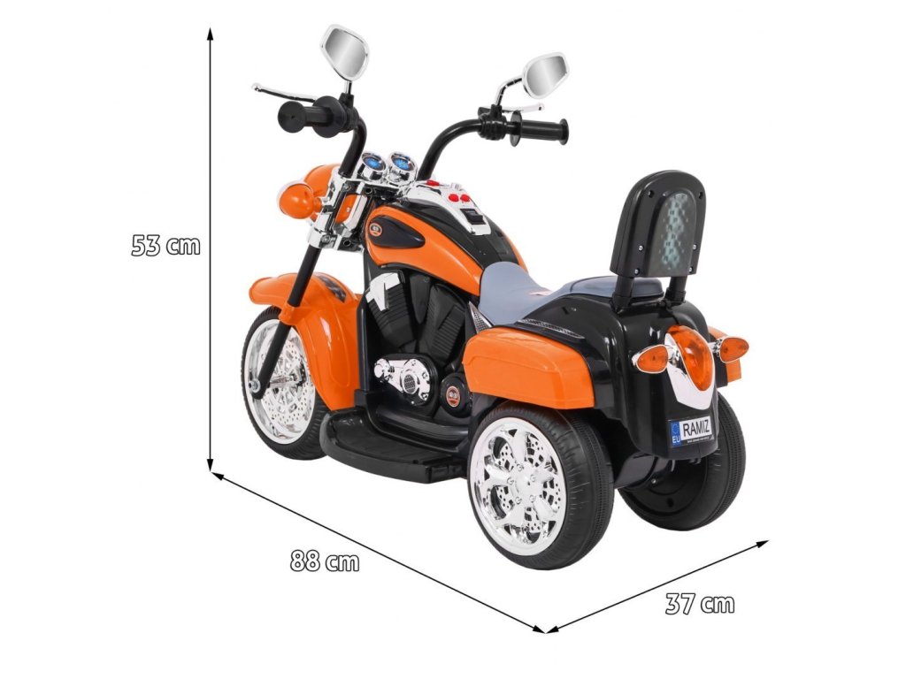 Motocikl Chopper vrhunske je kvalitete izrade. Dječji električni motocikl pomaze djeci u razvoju vozačkih vještina i ravnoteže. To je izvrstan dodatak za šetnje s obitelji ili provođenje vremena u vrtu. Motocikl može voziti naprijed i natrag. Dječji motocikl može postići brzinu od 3 km/h. Dječji motocikl Chopper ima svjetlosne i zvučne efekte. Motocikl je pogodan za djecu od 3 godine i nosi europski certifikat sigurnosti CE.
