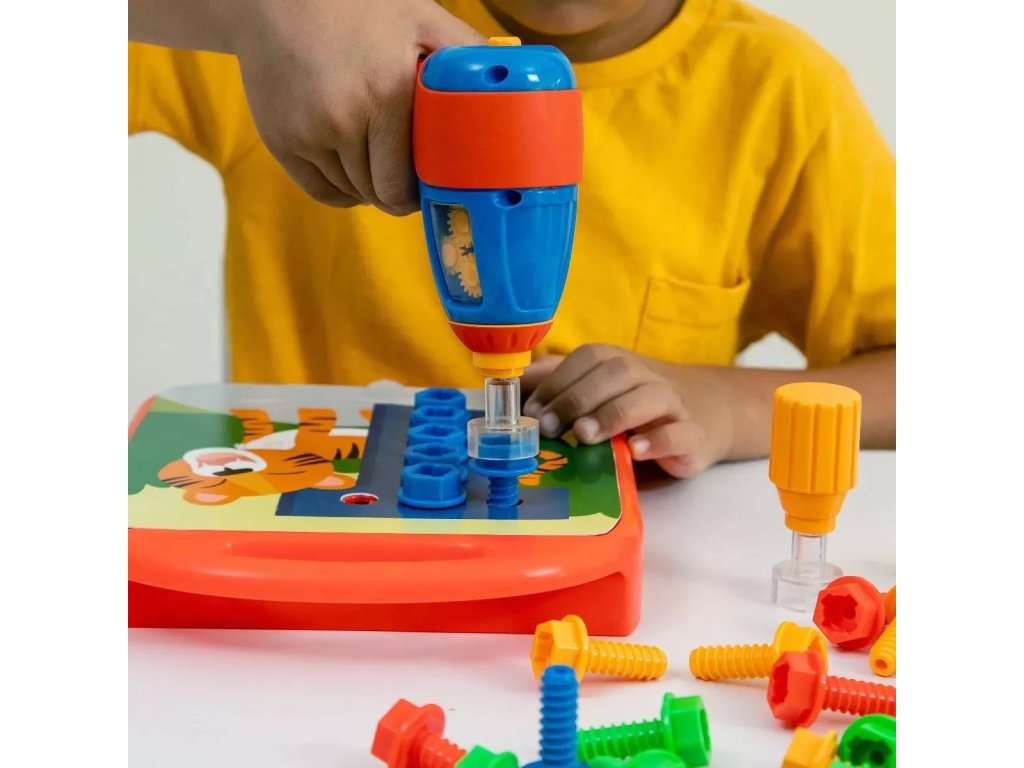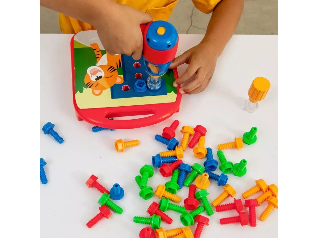 Karticu sa slovom ili brojem priložite na radnu ploču pomoću unaprijed perforiranih otvora. Pomoću dječje električne bušilice i šarenih vijaka dijete stvara zadanu sliku. Malim ručnim odvijačem vijci se mogu zatezati i popuštati.