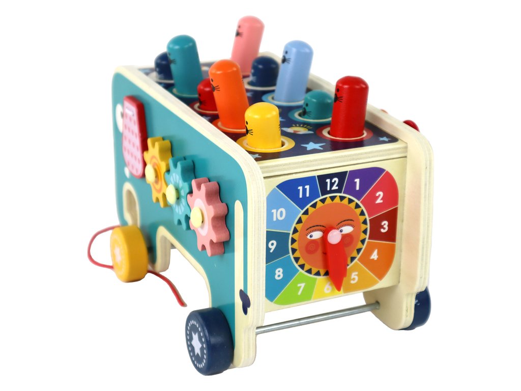 Set je potpun i uključuje auto sa konopcem za vučenje, 2 čekića za igru "Whac-a-Mole" i činelu. Igračka je izrađena od sigurnog drveta, što jamči izdržljivost i sigurnost za djecu.