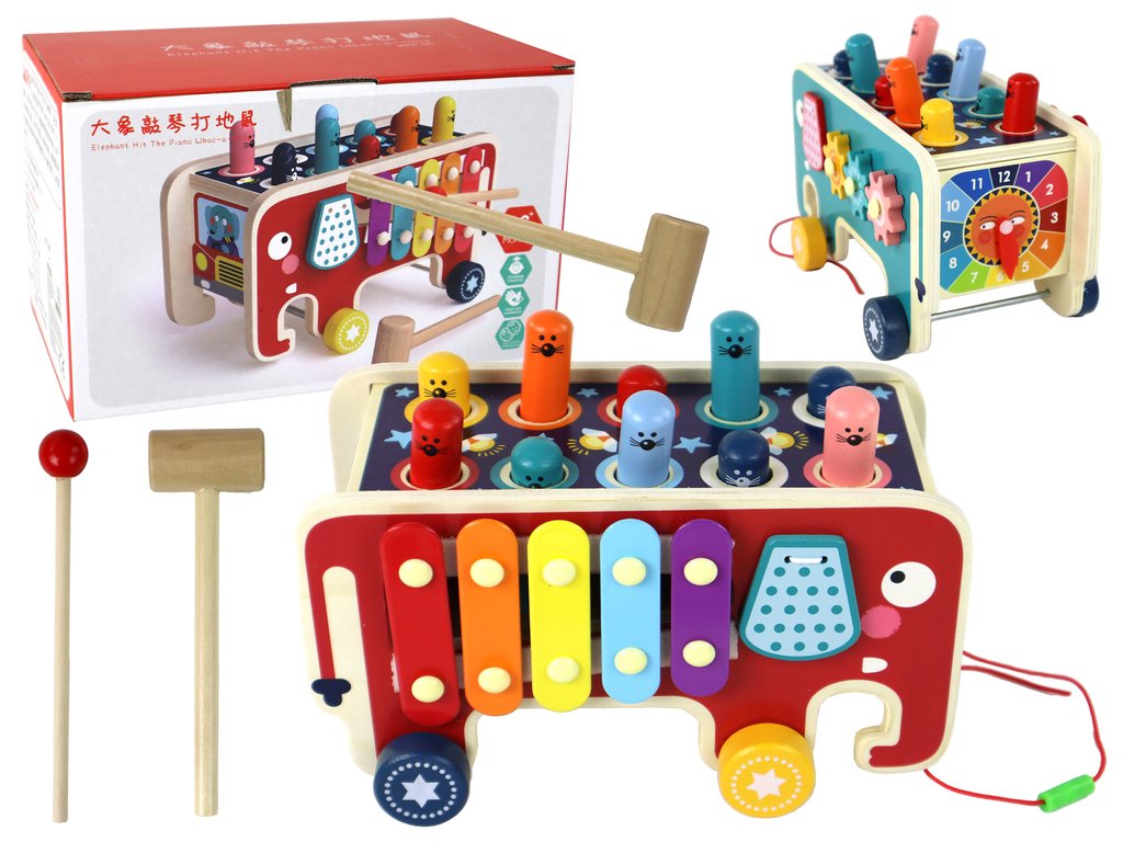 Set se sastoji od drvenog auta sa motivom slona koji privlači pažnju najmlađih. Na vrhu auta nalaze se šarene glave podzemnih životinja koje su meta igre "Whac-a-Mole". Djeca ih pokušavaju pogoditi priloženim čekićima, čime razvijaju svoju spretnost i motoričku koordinaciju.