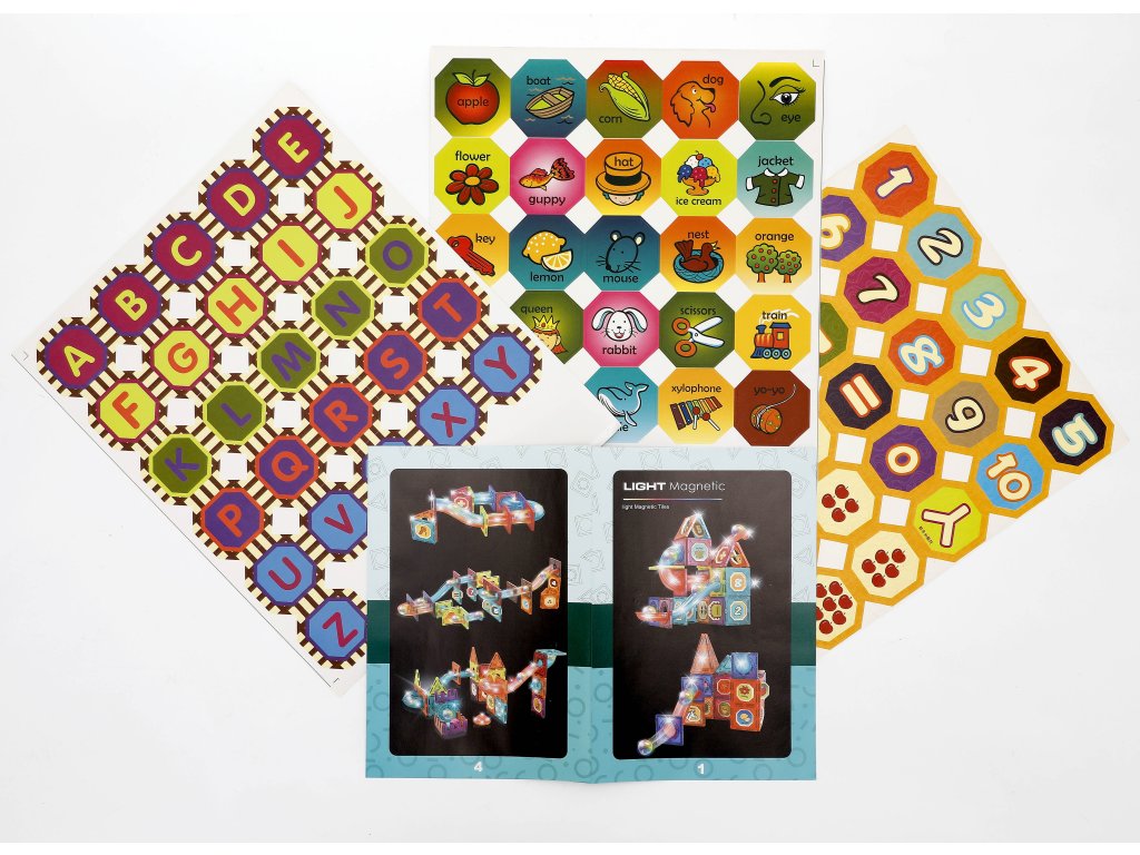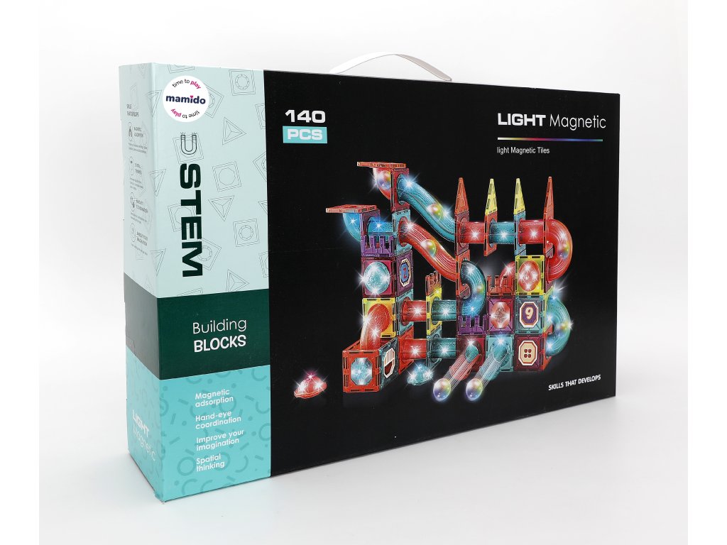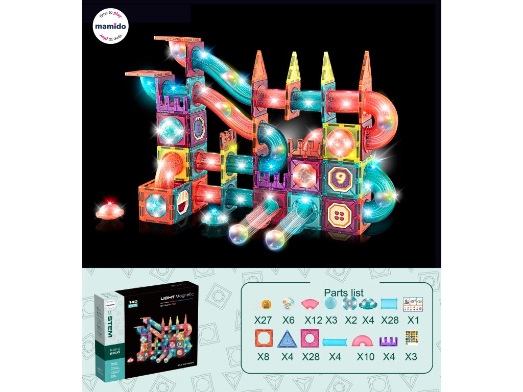 Magnetska slagalica sa 140 dijelova za izradu svjetlosnih konstrukcija, tornjeva, staza za kuglice i interaktivnih struktura. Dijelovi su prozirni, šareni i zahvaljujući jakim magnetima savršeno se drže zajedno. Set također uključuje elemente za stazu s kuglicama kao što su rampe, izlazi, lukovi, kuglice s LED elementima unutra (svjetlosni efekti) i također set naljepnica sa slovima, brojevima i slikama – djeca tako mogu graditi ne samo staze, već i učiti kroz igru.