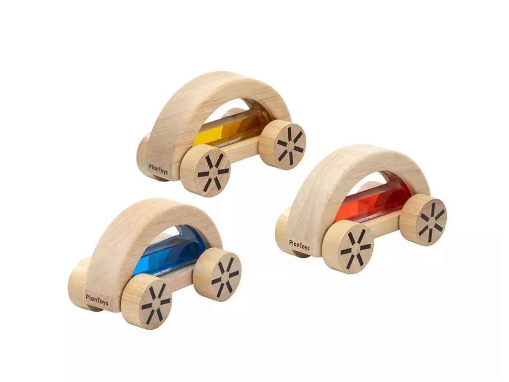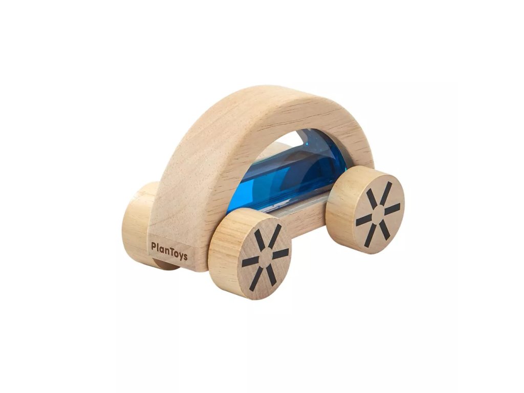 Plavi drveni autić polukružnog oblika s unutarnjom tekućinom marke PlanToys. Igračka potiče puzanje, promatranje kretanja vode i prepoznavanje boja.