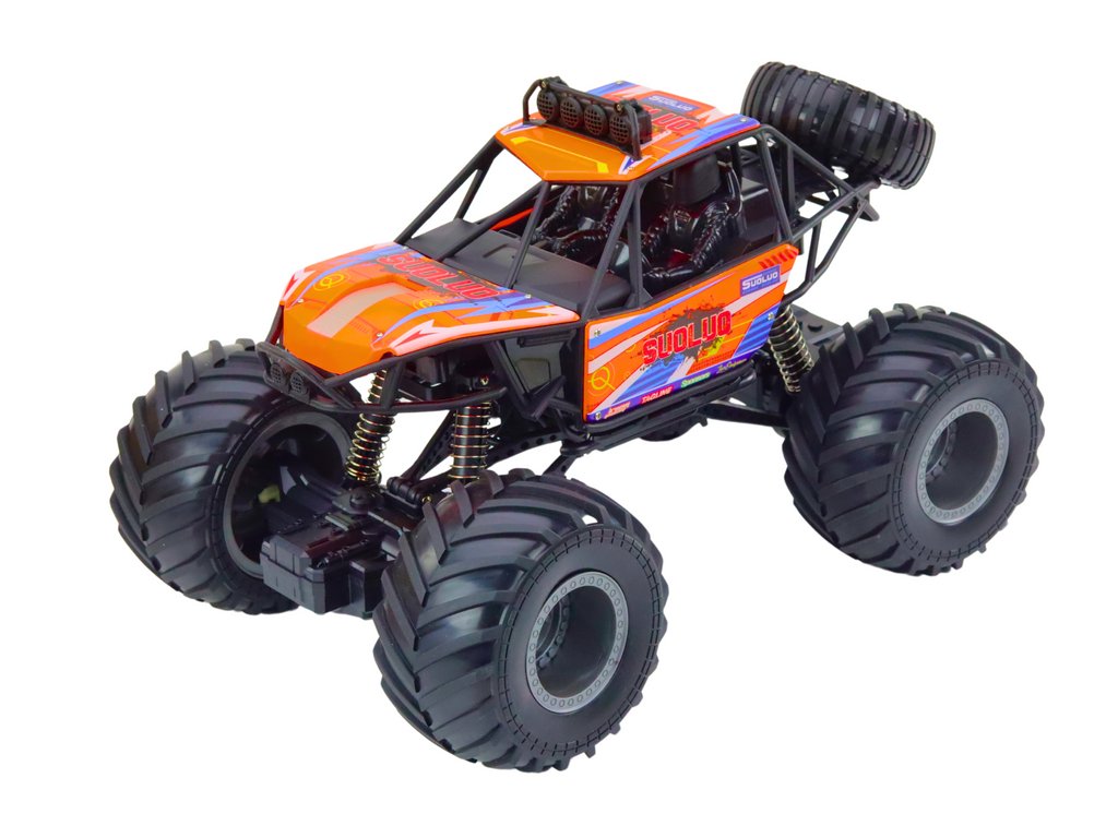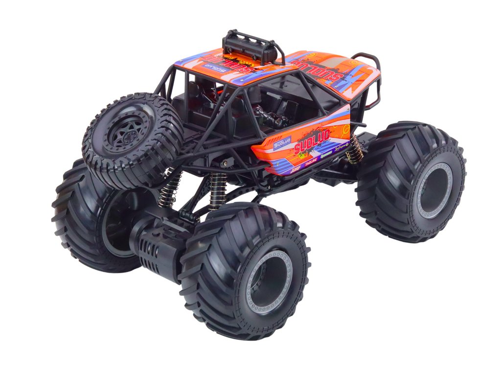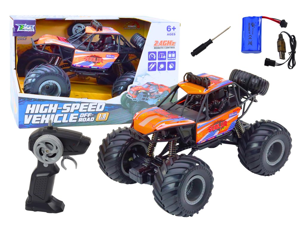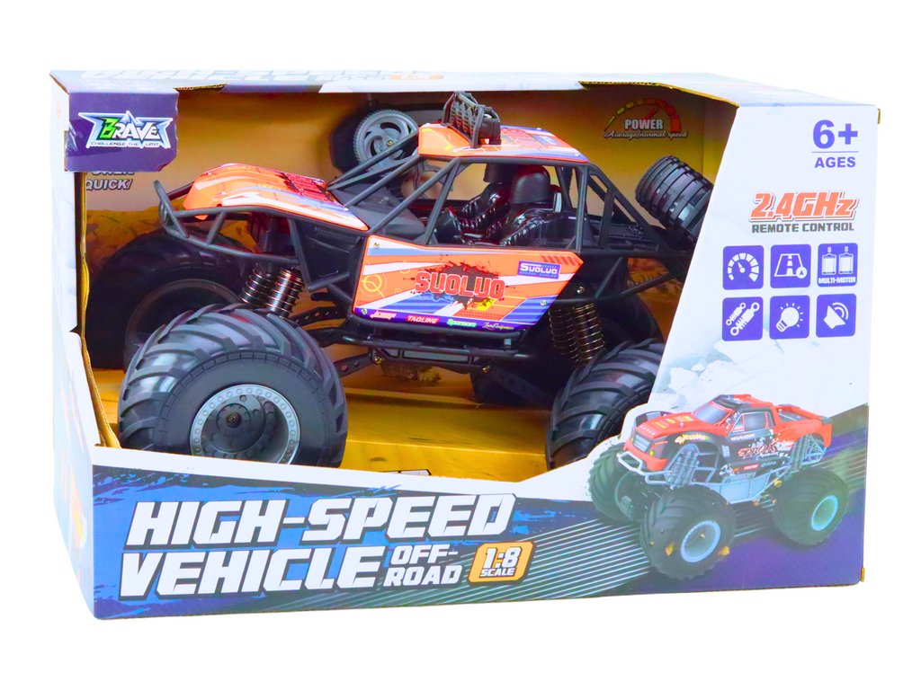 Terenski automobil na daljinsko upravljanje u omjeru 1:8 prava je atrakcija za mlade avanturiste. Obojana u intenzivnu narančastu boju, ova neustrašiva vozila privlače pozornost na prvi pogled. Opremljeni ogromnim, izdržljivim gumenim kotačima i naprednim amortizerima, spremni su uhvatiti se u koštac i sa najzahtjevnijim terenima.