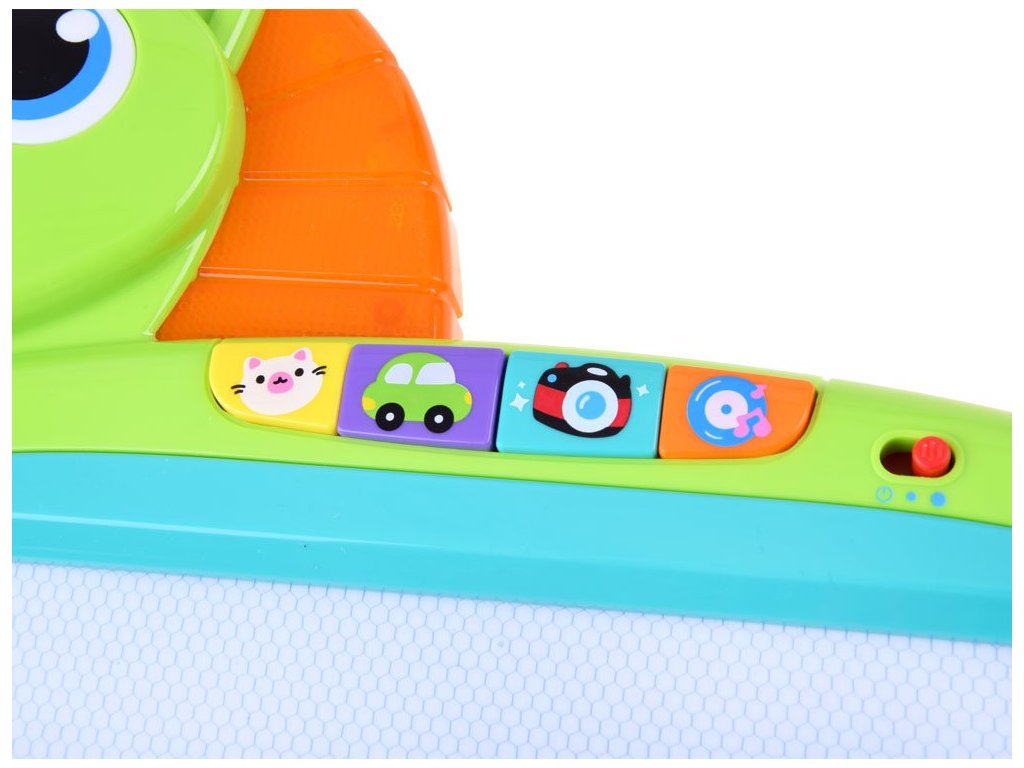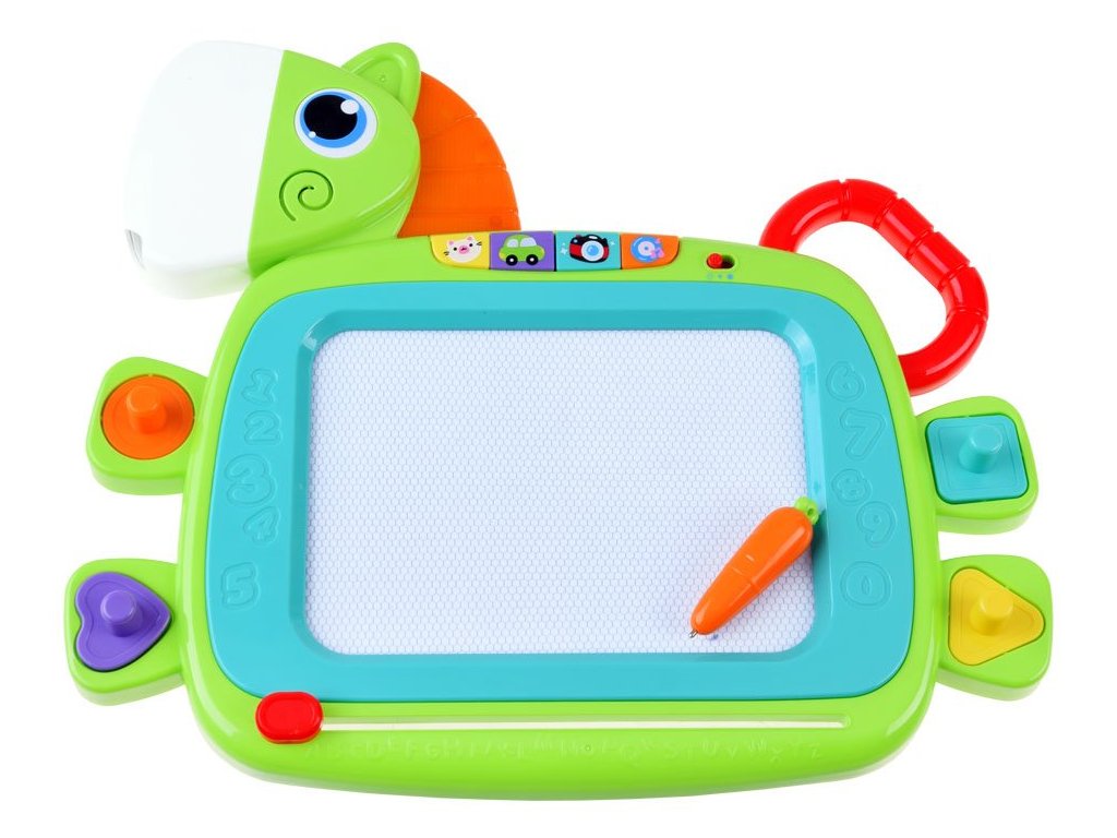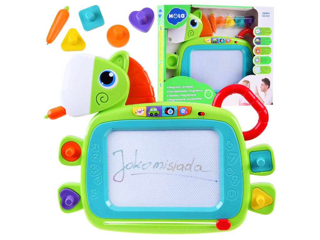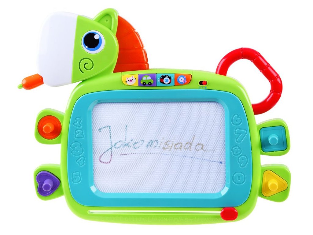 Šarena glazbena ploča s ponijem i pečatima je idealna za svakog malog istraživača. Vaše dijete možete zabaviti na kreativan način zahvaljujući ovoj glazbenoj ploči, koju možete lako ponijeti bilo gdje zahvaljujući ručki koja imitira rep konjića. Nudi zvukove i svjetlosne efekte koji će zasigurno privući pažnju djeteta. Na stražnjem dijelu ploče nalaze se šarena gumba koja pokreću različite zvukove - mačka, auti, svakodnevni zvukovi i melodijske note. Kad pritisnete gumbe, počne svijetliti i griva konjića.