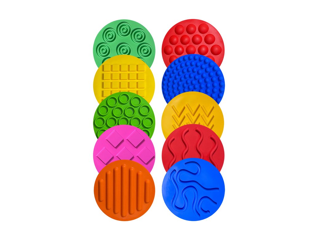 Set se sastoji od 10 diskova , svaki s jedinstvenom teksturom i bojom, što omogućuje različite senzorne aktivnosti. Djeca mogu dodirivati, uspoređivati, prepoznavati različite površine, što podupire razvoj njihove taktilne percepcije i koordinacije pokreta .