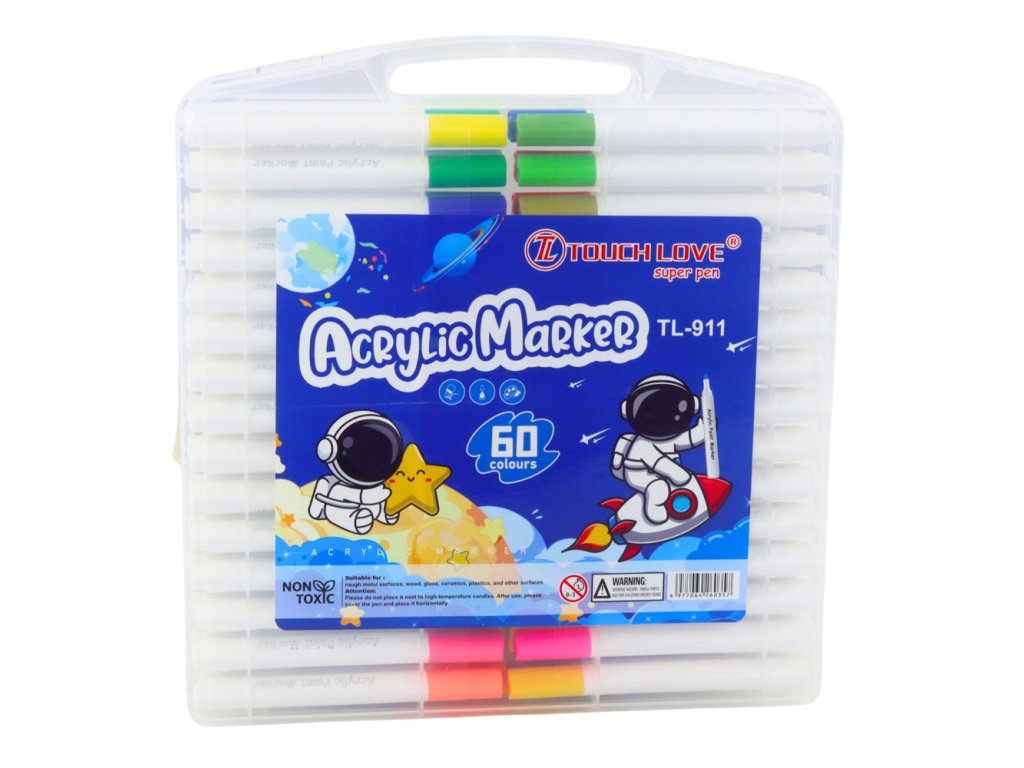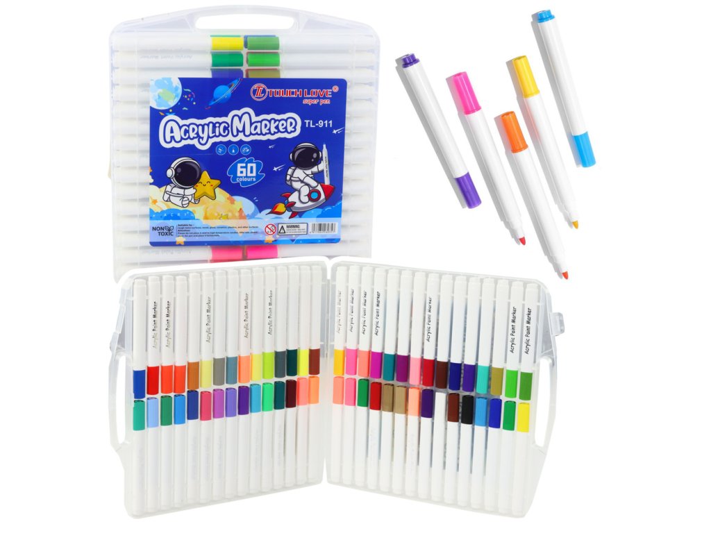 Set akrilnih markera To je savršen alat za svakog mladog umjetnika i ljubitelja umjetnosti. Visokokvalitetni markeri u 60 intenzivnih boja omogućuju vam stvaranje jedinstvenih umjetničkih i dekorativnih projekata. Zahvaljujući sastavu akrilne tinte, boje su otporne na blijeđenje i habanje te pružaju izvrsnu pokrivenost na različitim površinama kao što su papir, karton, drvo, plastika ili staklo. Njihova iznimna pigmentacija čini svaki crtež odvažnim i punim boja, što ih čini idealnim za svakodnevno crtanje i profesionalno umjetničko stvaranje.