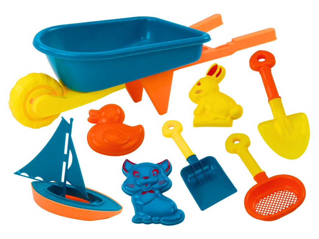 Set igračaka za pijesak u bojama tirkizne, žute i narančaste je kompletan alat za kreativnu igru na plaži ili pješčaniku. Glavni element seta je multifunkcionalni toczka, koja ne samo da služi za prijenos pijeska, već može poslužiti i kao lijevak za prelijevanje vode.