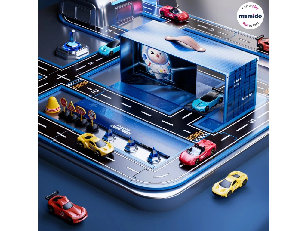 Djeca mogu birati između raznih dizajna, miješati boje i sastavljati startno polje za utrke. Savršeno kao dodatak garažama, parkiralištima ili trkaćim stazama.