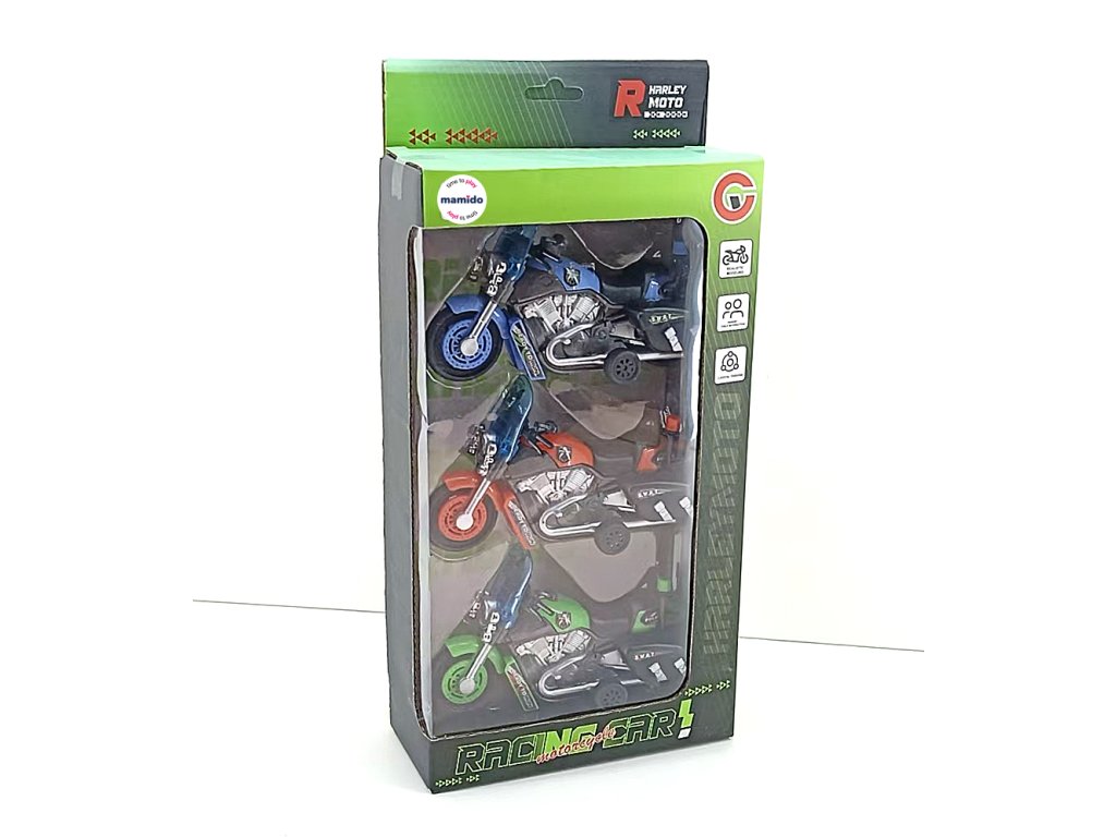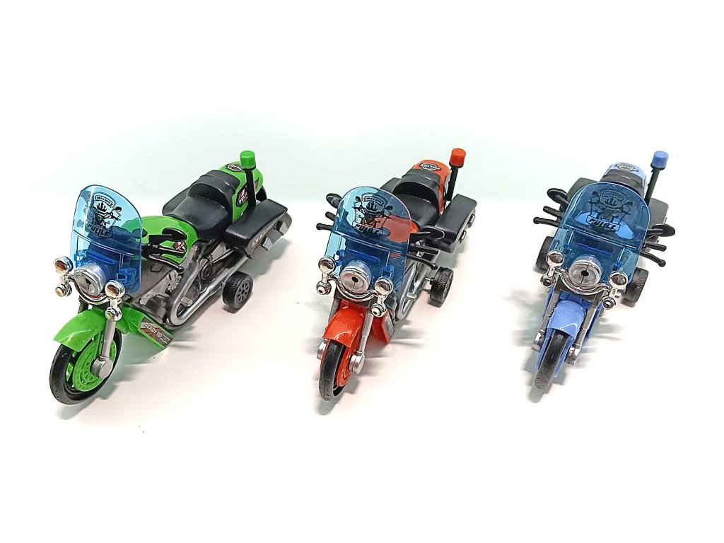Stilizirani set od tri policijska motocikla s pull-back pogonom (povucite unatrag i pustite) odlična je igračka za male motocikliste. Motocikli imaju zaštitni štit, sirenu i prtljagu, tako da izgledaju kao pravi policijski strojevi. Izrađeni su u atraktivnim bojama – zelenoj, narančastoj i plavoj.