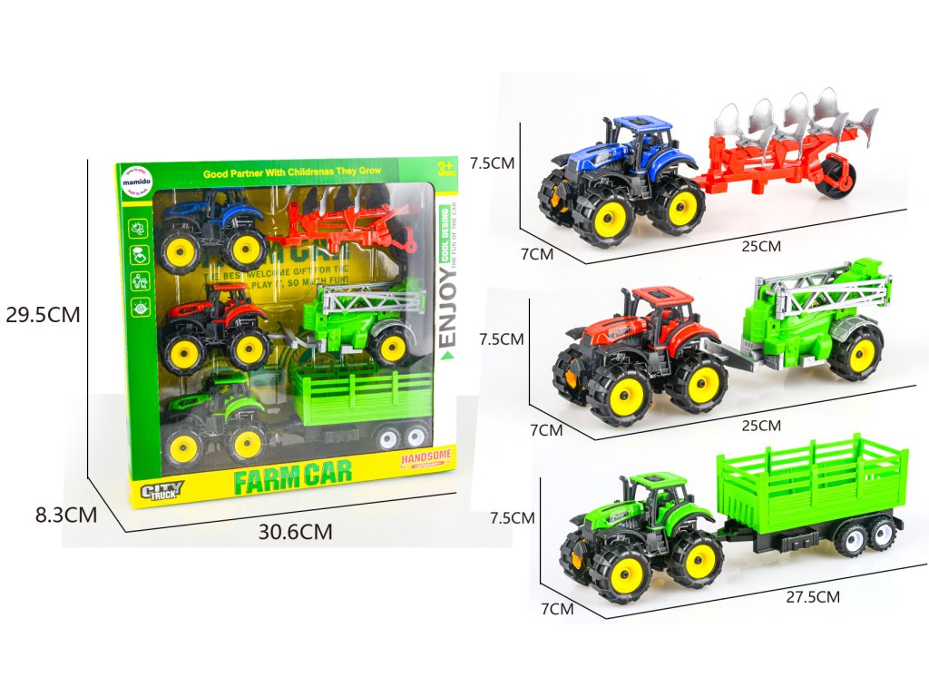 Šarena garnitura od tri traktora s prikolicama razveselit će sve male ljubitelje poljoprivrednih strojeva. Svaki traktor ima robusan off-road izgled, pogon na zamašnjak i priključenu radnu prikolicu. Djeca se mogu igrati kao farmeri, orati polja, prevoziti teret ili zalijevati usjeve.