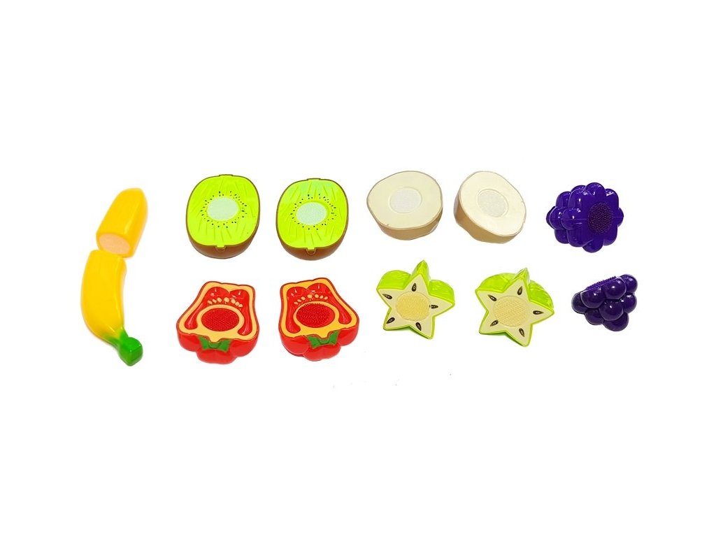 Povrće i voće mogu se sjeći na polovice, povezani su čičak trakom, pa ih je lako ponovno sastaviti. Osim zdravih proizvoda, set također sadrži proizvode brze hrane kao što su pomfrit, pizza ili slatkiši. Set dalje uključuje plastični pribor za jelo, nož i malu dasku za rezanje. Materijal voća i povrća je plastika.