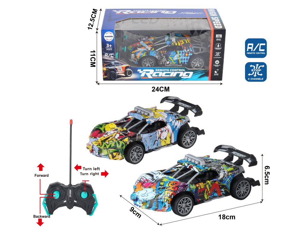 Stilski RC sportski automobil s graffiti dizajnom donijet će djeci adrenalinsku vožnju punu zabave. Zahvaljujući upravljanju, svladava vožnju naprijed, natrag, lijevo i desno. Model se ističe atraktivnim izgledom s velikim stražnjim spojlerom i sportskim detaljima koji podsjećaju na pravi trkaći automobil.