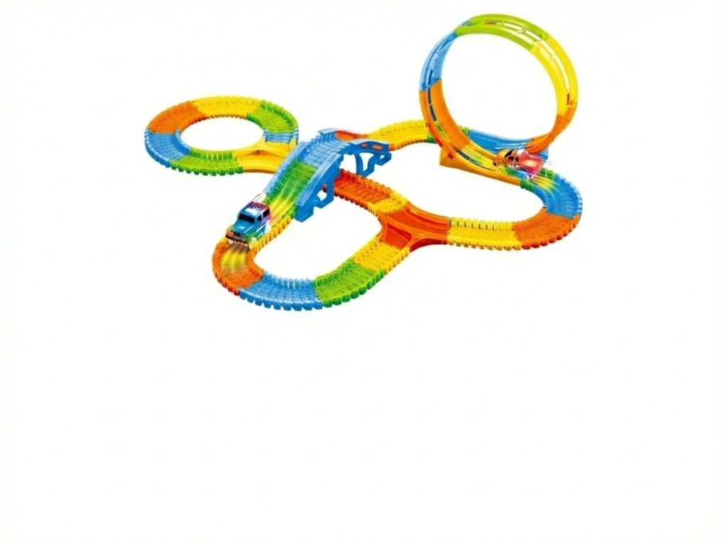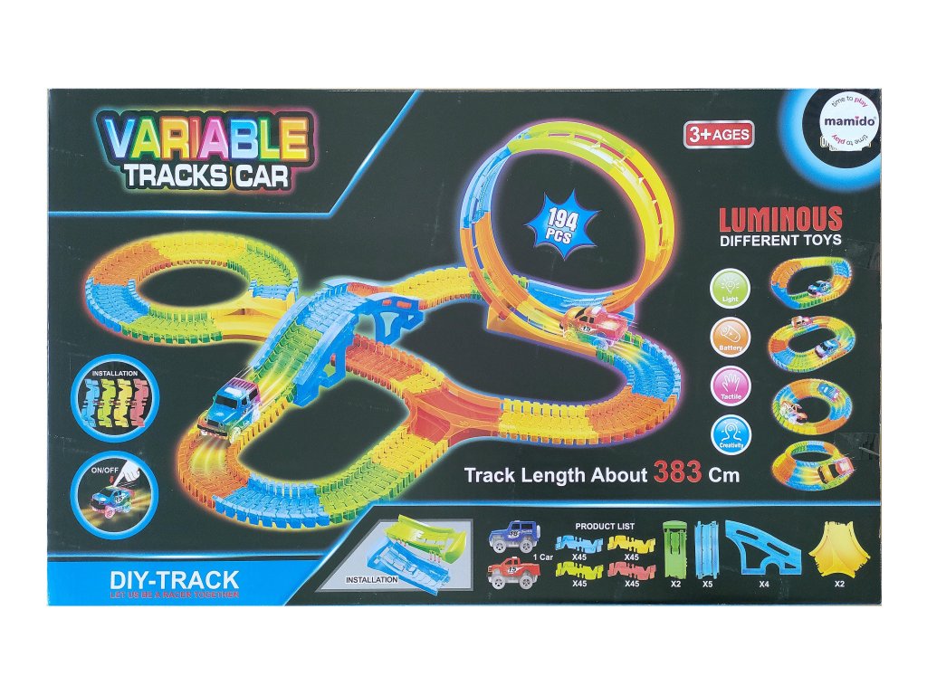 Šarena svjetleća autodráha ukupne duljine do 383 cm donijet će djeci sate zabave. Staza se sastoji od 194 dijela, koji se mogu slobodno sastavljati, a uključuje i mostove, petlje i zavoje. Paket uključuje LED autić, koji svijetli tijekom vožnje i prolazi cijelom stazom uključujući petlju. Zahvaljujući jednostavnom sustavu spajanja, djeca mogu svaki put sastaviti stazu drugačije, razvijajući tako svoju kreativnost i maštu.