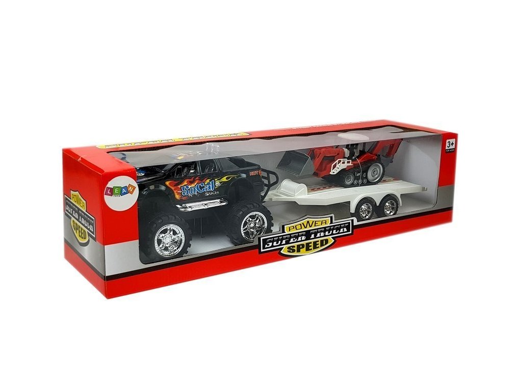 Terensko vozilo s prikolicom i bagerom na navijanje pružit će djeci mnogo zabave. Terensko vozilo ima pogon na navijanje, tako da ga samo treba navući unatrag i pustiti da juri naprijed. Prikolicu je moguće pričvrstiti na terensko vozilo ili koristiti svaki dio zasebno. Bager ima žlicu za kopanje i dvije pokretne lopatice.